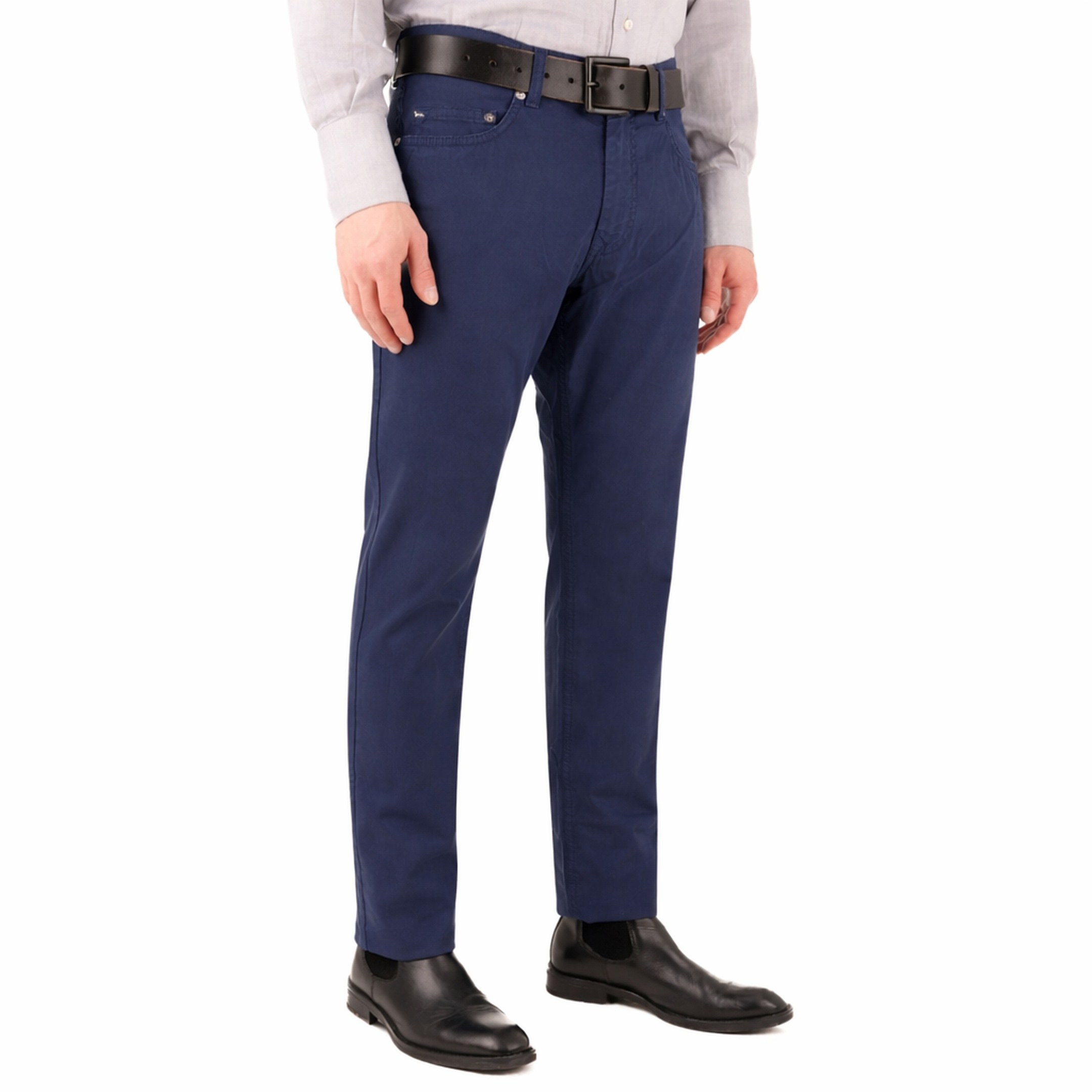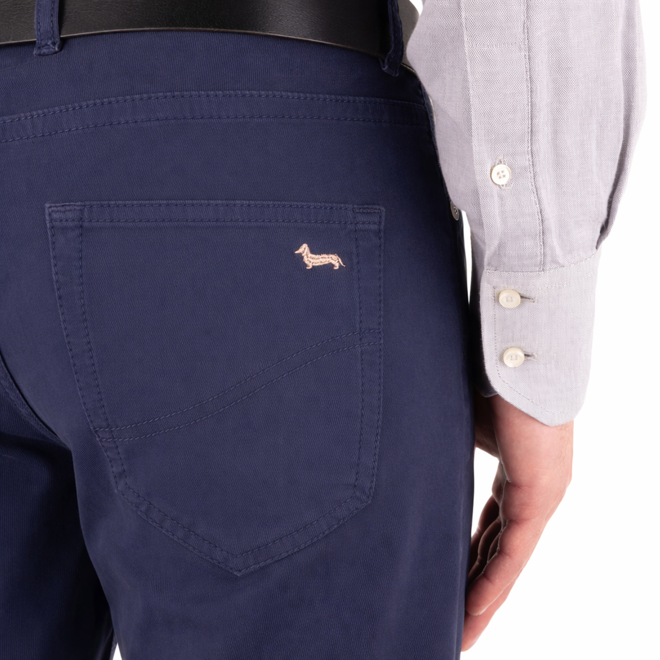 Questi pantaloni Harmont & Blaine presentano una struttura a cinque tasche dal taglio jeans nitido e rigoroso. La linea narrow fit segue la gamba con precisione, garantendo una silhouette asciutta e pulita. Realizzato prevalentemente in cotone con una piccola percentuale di elastam, il tessuto assicura una vestibilità flessibile ma strutturata. Chiusura frontale con zip e bottone metallico logato, impunture tono su tono e rivetti rinforzati definiscono l’estetica di questo capo essenziale. La semplicità della tinta unita mette in risalto la qualità sartoriale della manifattura e la cura nei dettagli tecnici.
