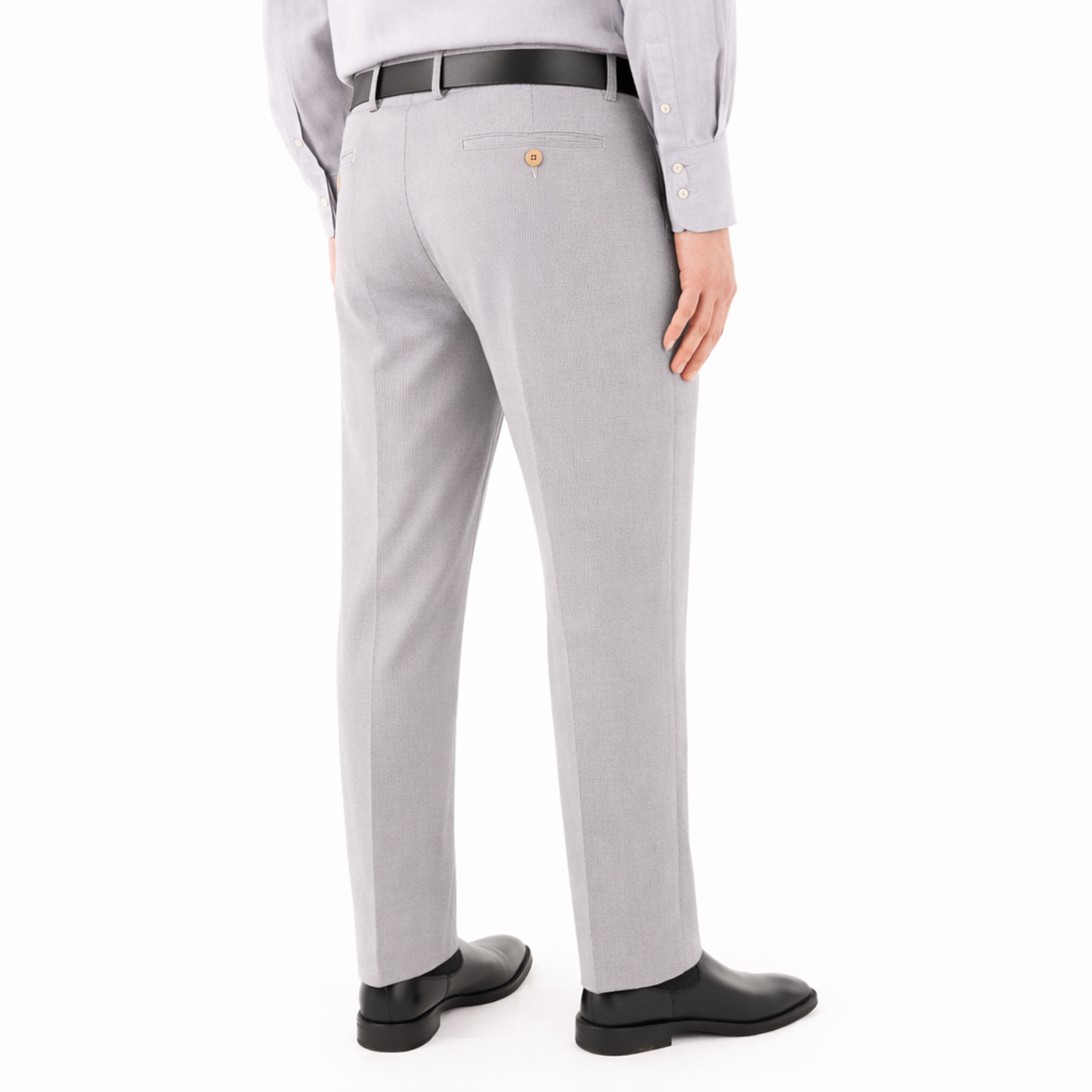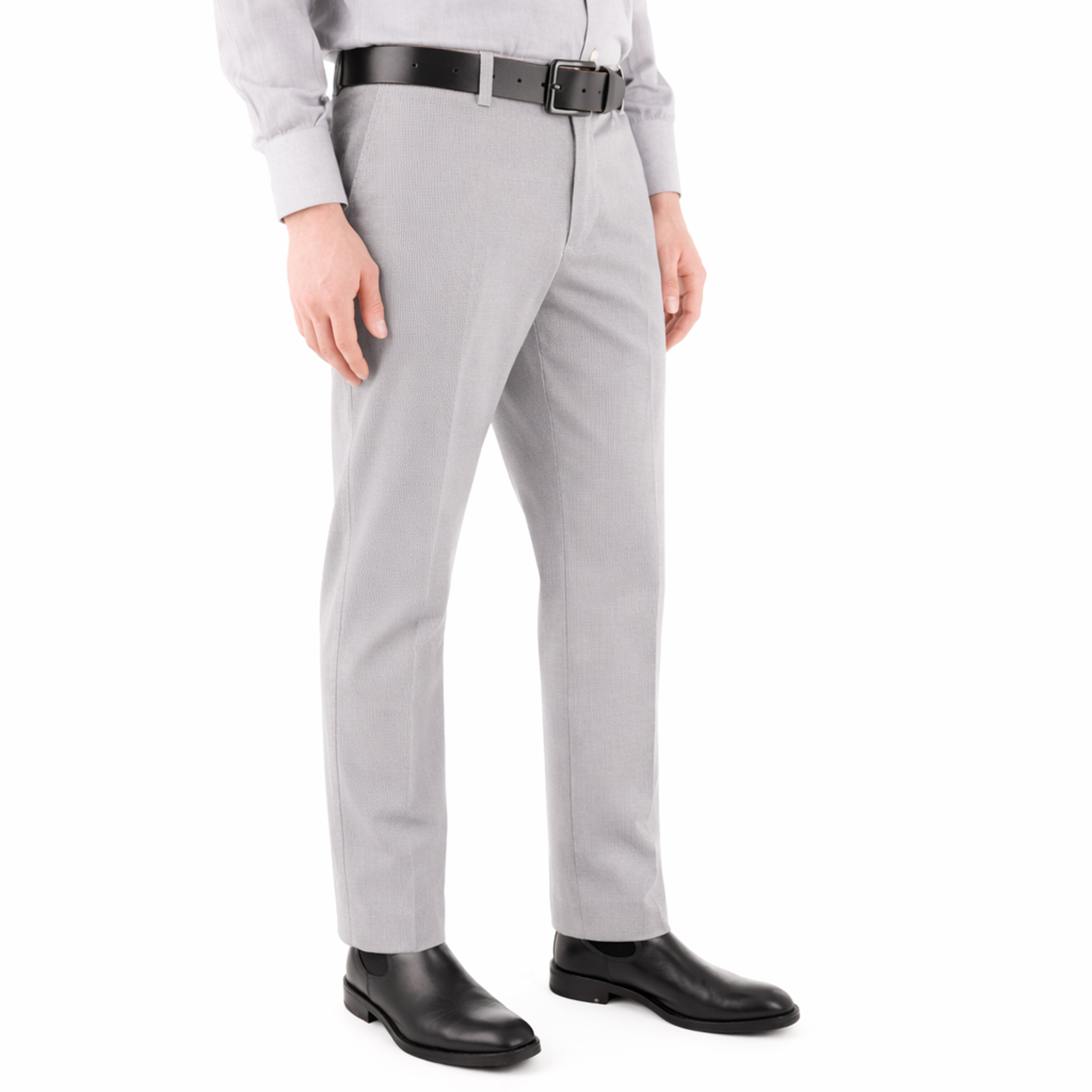 Pantaloni Harmont & Blaine caratterizzati da una silhouette narrow fit che segue con precisione le linee del corpo. La struttura a cinque tasche si fonde con il rigore del modello chino, presentando una chiusura frontale con zip e bottone metallico. Il tessuto bicolore rivela una trama a piccoli quadretti, aggiungendo profondità visiva alla superficie. Un discreto logo ricamato firma il capo, sottolineando l'attenzione per i dettagli sartoriali. La gamba asciutta termina con un orlo pulito, mantenendo una linearità costante dai fianchi alla caviglia.