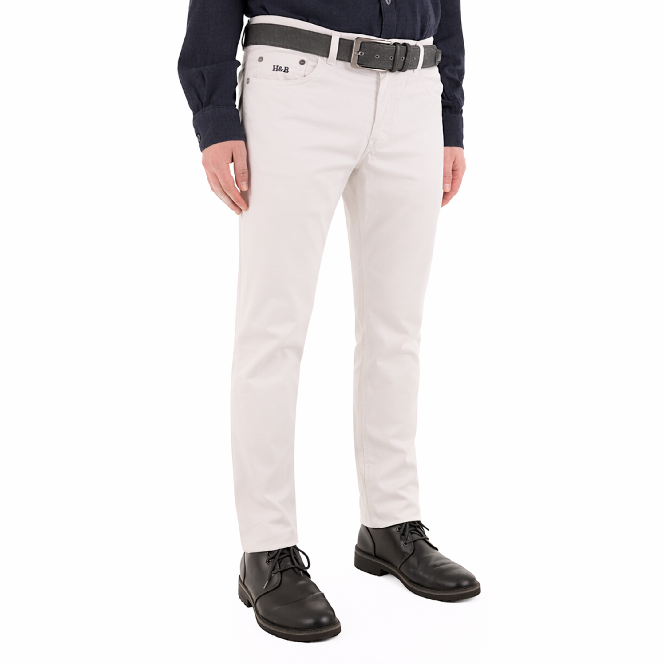 Realizzati interamente in Italia, questi pantaloni Harmont & Blaine presentano un taglio cinque tasche di derivazione denim. La struttura in cotone al novantasette per cento assicura una consistenza solida, mentre la piccola percentuale di elastam favorisce il movimento naturale. Il modello narrow fit segue la gamba senza costringerla, terminando con un fondo asciutto. Notiamo la chiusura frontale con zip e bottone metallico e il logo ricamato con precisione sulla tasca anteriore. Le cuciture tono su tono mantengono un'estetica pulita e rigorosa.