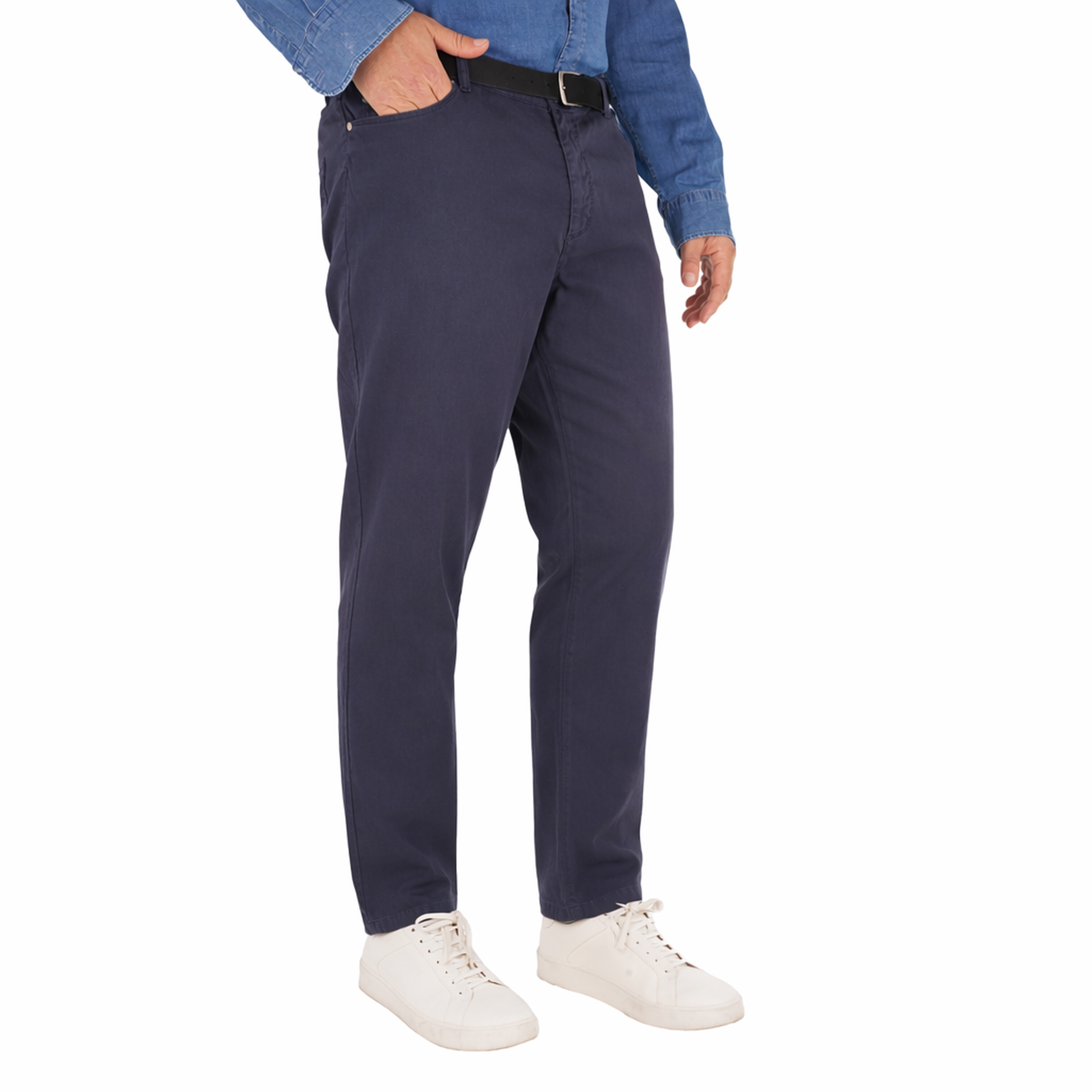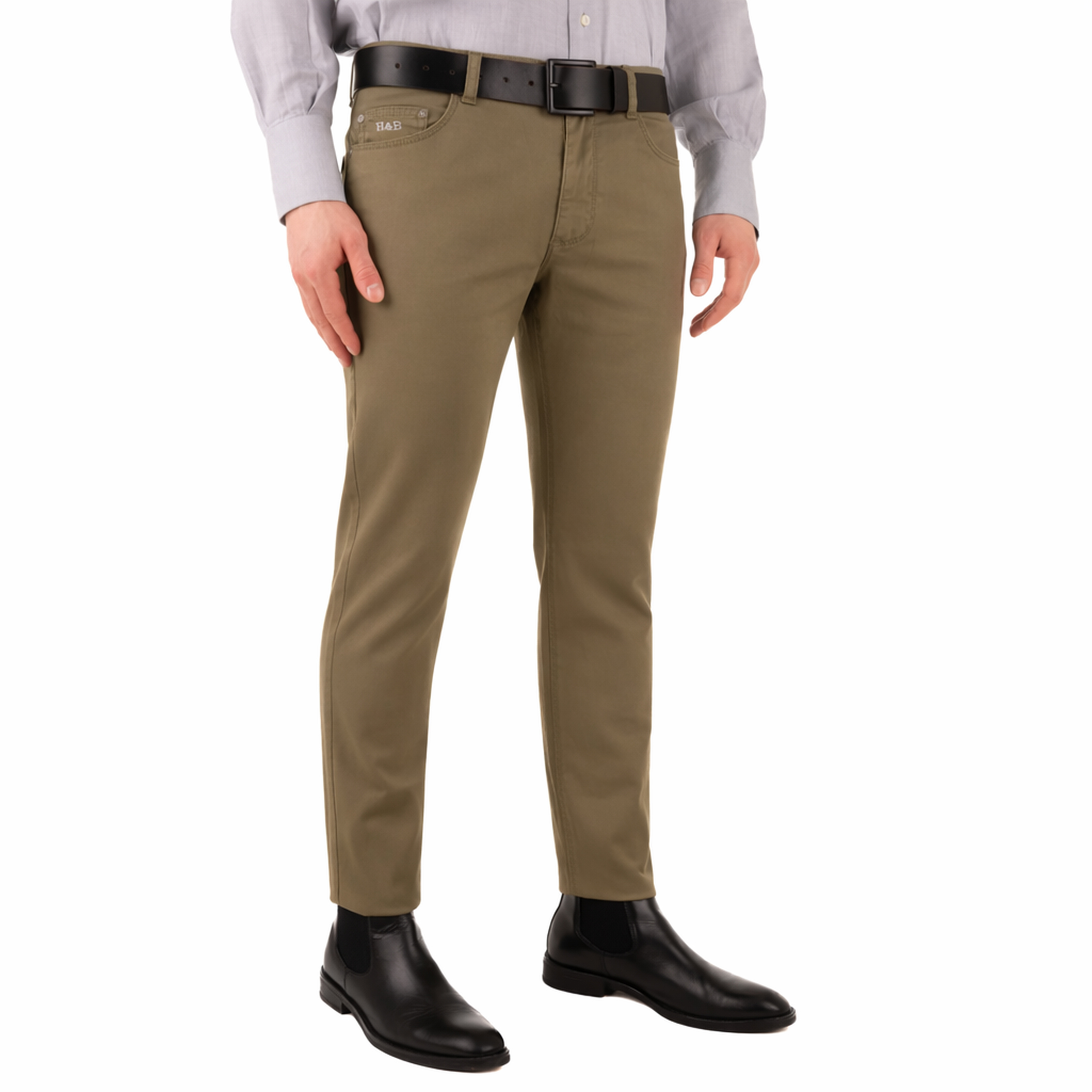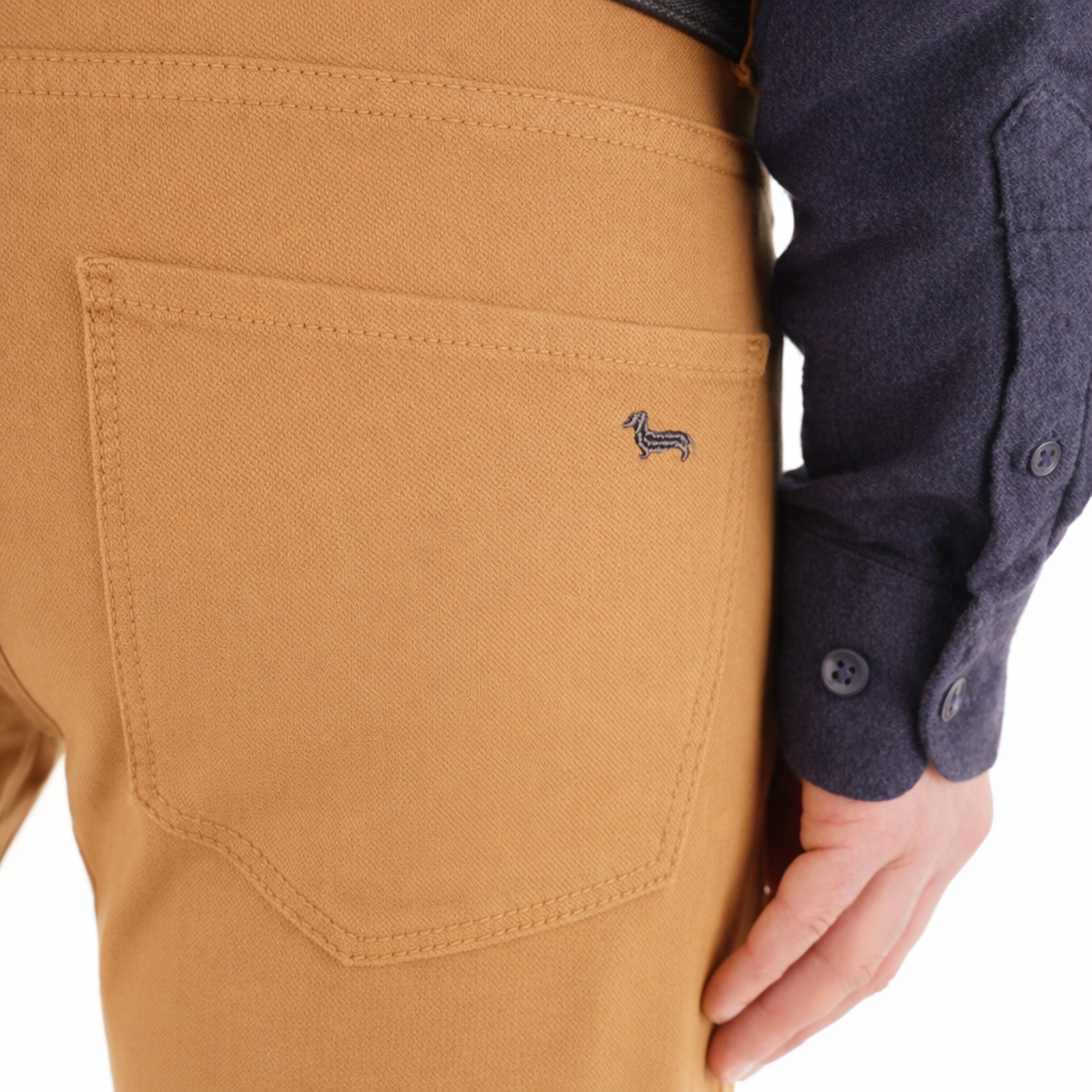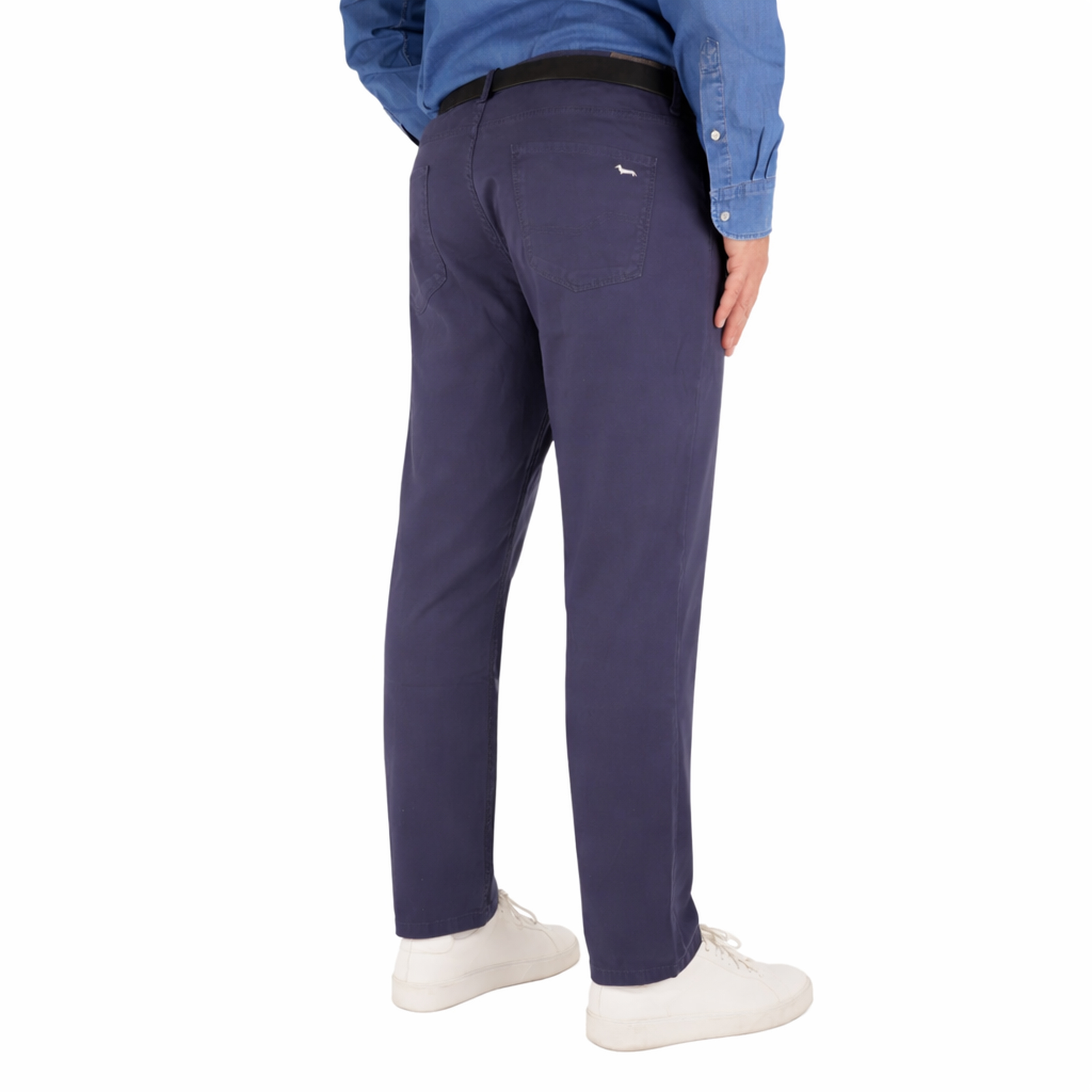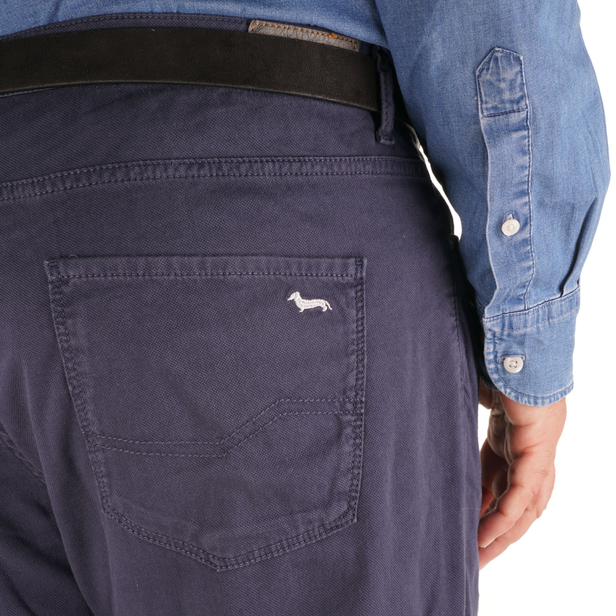 La silhouette asciutta e pulita definisce questi pantaloni Harmont & Blaine, caratterizzati da un taglio cinque tasche d'ispirazione denim. Il fit slim aderisce con garbo alla gamba, valorizzando la struttura lineare del capo. Realizzati prevalentemente in cotone con una piccola percentuale di elastam, offrono una flessibilità naturale nei movimenti quotidiani. La chiusura frontale prevede un bottone metallico e una pratica zip a scomparsa. Piccoli rivetti rinforzano le tasche, mentre il logo discreto applicato sul davanti firma l'opera con un tocco di sobrietà ed eleganza.