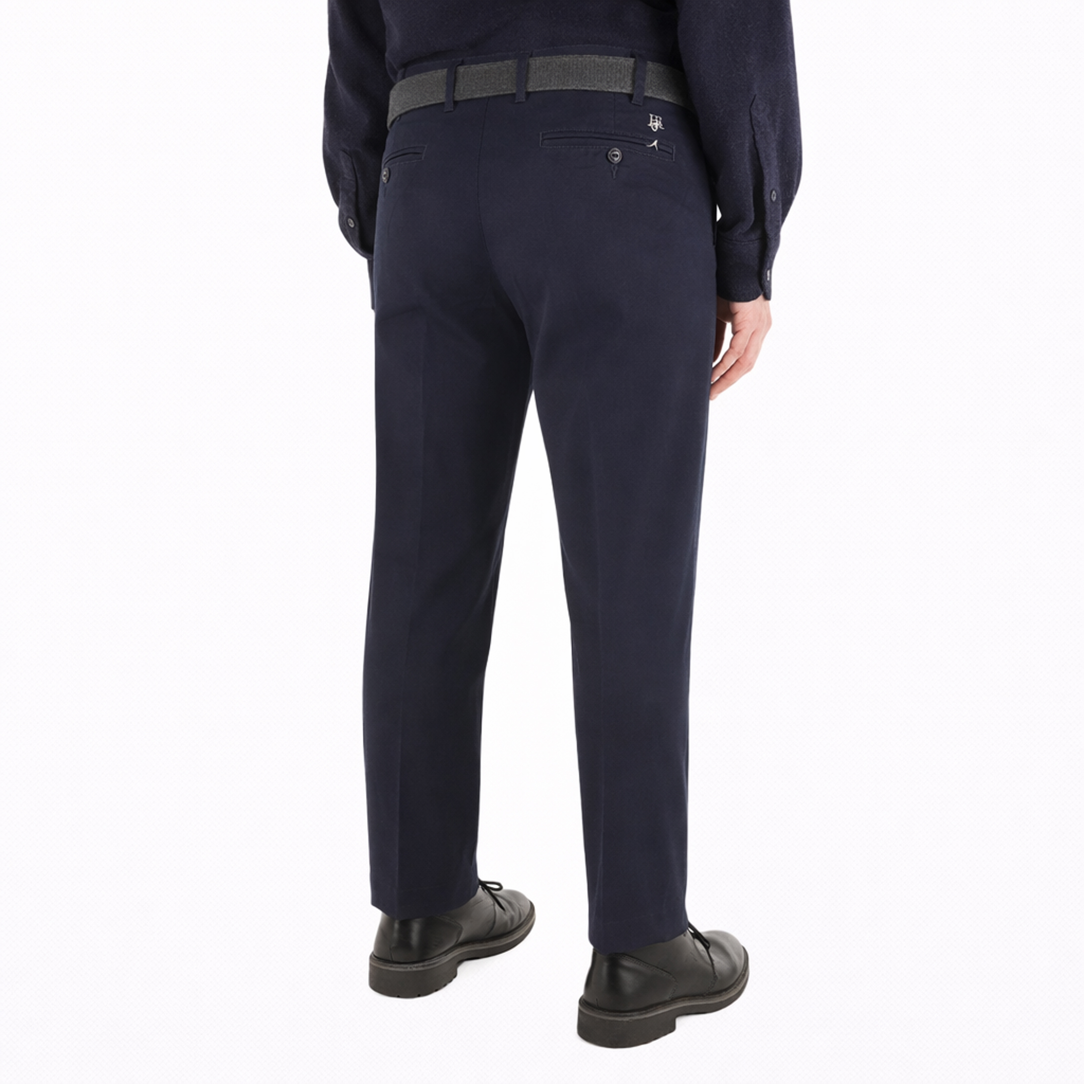 Harmont & Blaine Jeans propone un pantalone cinque tasche dalla struttura equilibrata, dove il cotone elasticizzato definisce un taglio asciutto. La costruzione richiama la praticità del denim ma si esprime attraverso una finitura a tinta unita che valorizza la linearità della gamba. Chiusura frontale con zip e bottone metallico coordinato, passanti resistenti e un logo ricamato con cura completano il modello. Un capo pratico che privilegia la libertà di movimento senza rinunciare a un profilo ordinato e rigoroso.