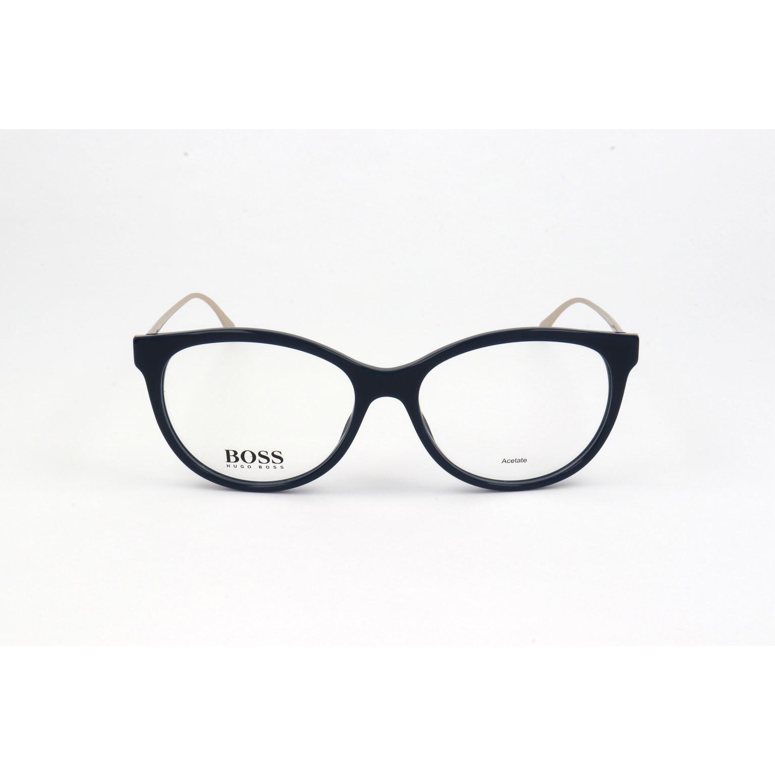 Questi occhiali firmati HUGO BOSS presentano una montatura dalla silhouette leggermente allungata che richiama un'estetica sofisticata. Il frontale deciso si contrappone alla leggerezza delle aste metalliche, creando un equilibrio visivo di grande impatto per l'esposizione in vetrina.
