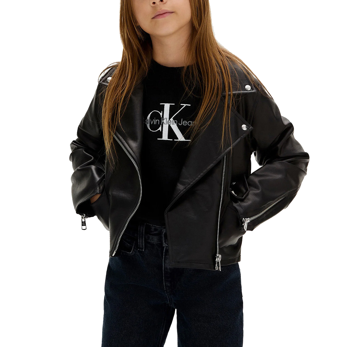 STUDDED LEATHER JACKET, LEATHER JACKET, FOR GIRLS, POCKETS, LONG SLEEVES, SOLID COLOUR, WITH LOGO, ZIP CLOSURE, FAUX LEATHER BIKER JACKET