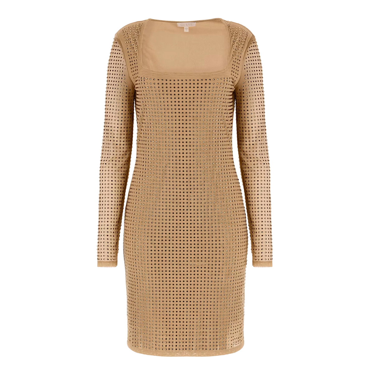 KNEE-LENGHT DRESS, FOR WOMEN, DEEP NECKLINE, LONG SLEEVES, SOLID COLOUR, WITH LOGO