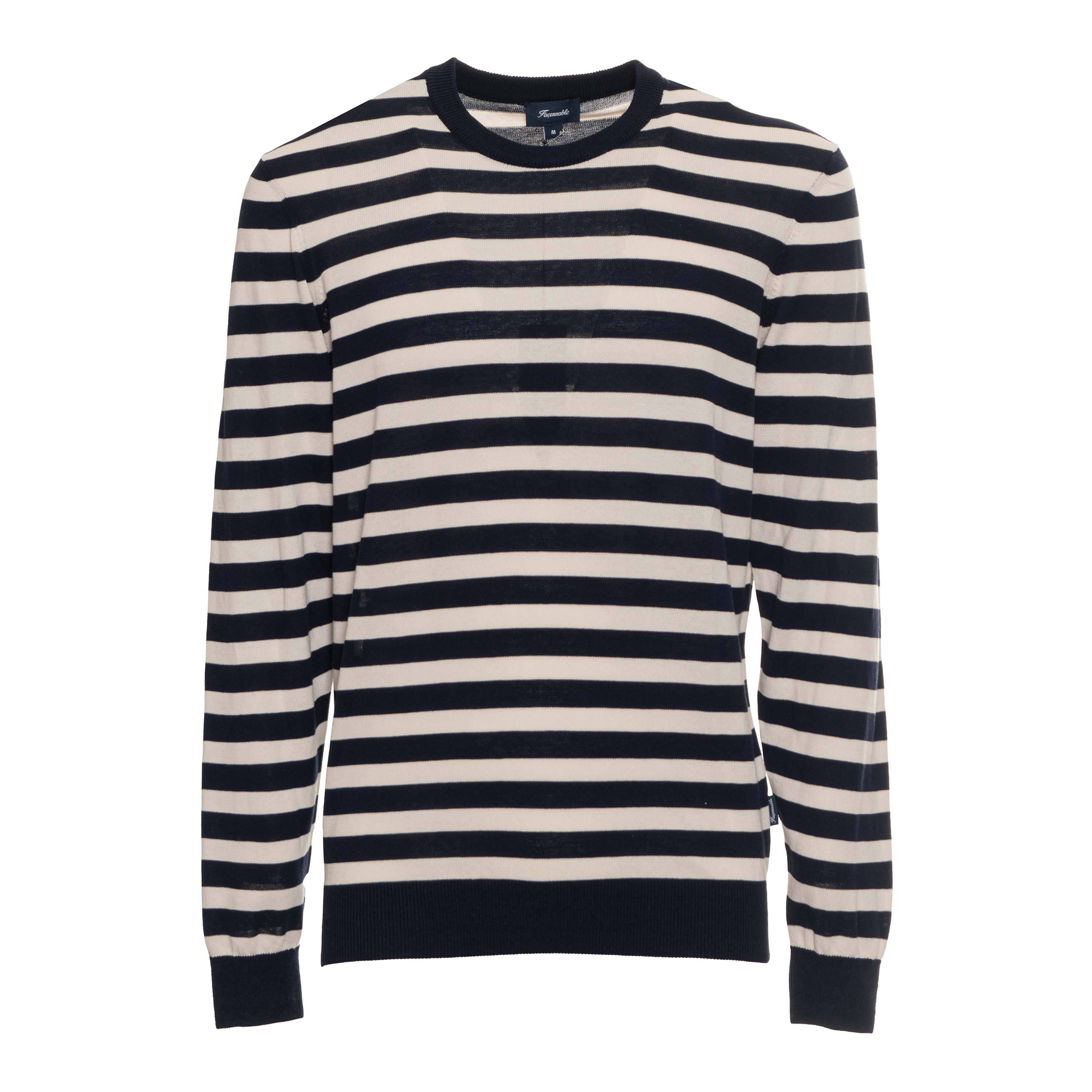 Ta maglie STR ICE CTN CREW NK marki FACONNABLE to elegancki sweter w poziome pasy, który łączy tradycyjne krawiectwo z nowoczesną formą. Charakterystyczne ściągacze przy dekolcie, mankietach i na dole swetra zapewniają doskonałe trzymanie fasonu i dodają całości subtelnego sznytu. Długie rękawy i klasyczny krój sprawiają, że jest to produkt o dużej wartości ekspozycyjnej w profesjonalnym salonie mody.