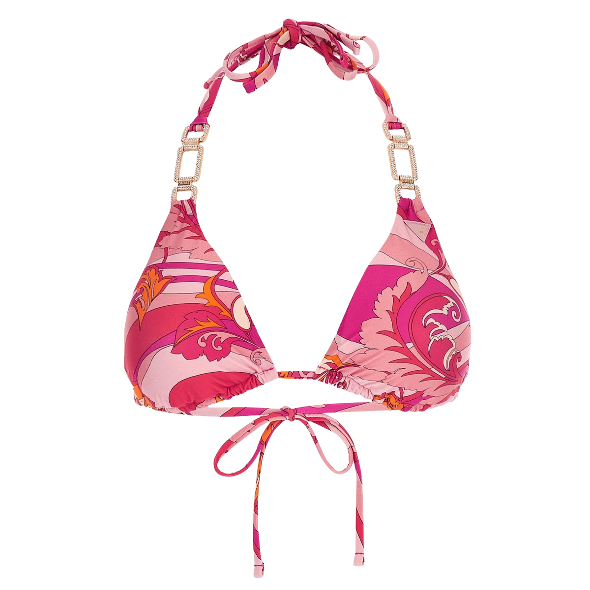 Ten top bikini REMOVABLE PADDED TRIANGLE marki GUESS to kwintesencja nowoczesnego szyku, w której główną rolę odgrywają detale konstrukcyjne. Klasyczny fason trójkąta został wzbogacony o prostokątne ogniwa łańcucha przy ramiączkach, zdobione lśniącymi elementami, co nadaje całości luksusowy charakter i dodatkową stabilność formy.