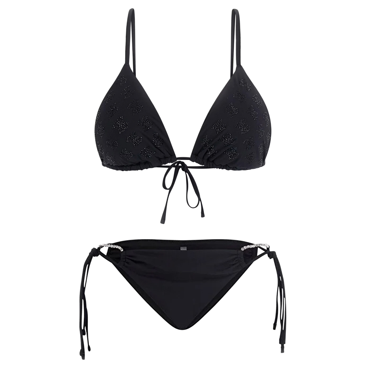 Ten bikini od GUESS prezentuje klasyczny fason trójkątny z funkcjonalnym wiązaniem na szyi oraz plecach. Górna część została wzbogacona o regularny motyw logo, który nadaje całości wyrafinowanego charakteru. Dół o niskim stanie z bocznymi troczkami pozwala na precyzyjne dopasowanie, a subtelny metalowy element przy pasku podkreśla markowy rodowód produktu.