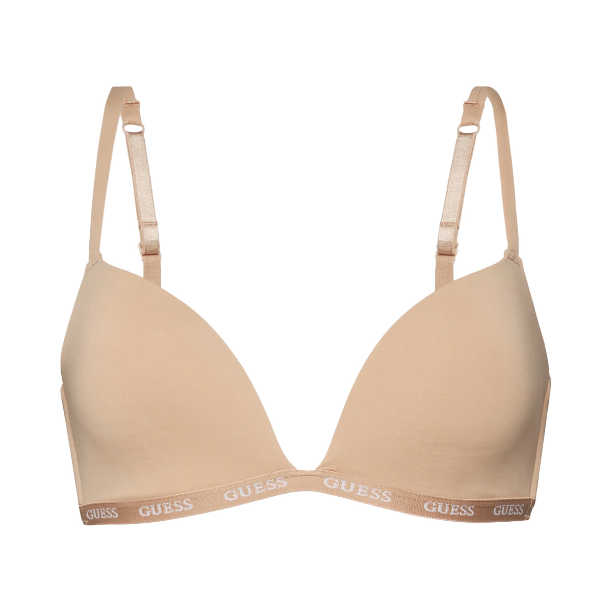 Ten REGGISENO DARCEY PADDED TRIANGLE marki GUESS to propozycja łącząca funkcjonalność z wyrazistym stylem. Wyściełane miseczki o trójkątnym kroju tworzą gładką linię pod ubraniem, a elastyczna taśma z logo pod biustem stanowi mocny akcent wizualny, podkreślający prestiż marki.