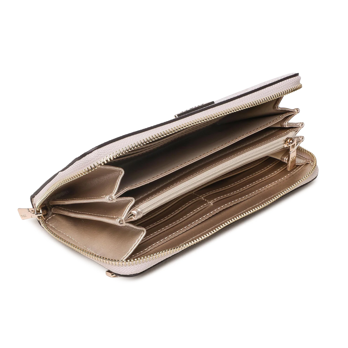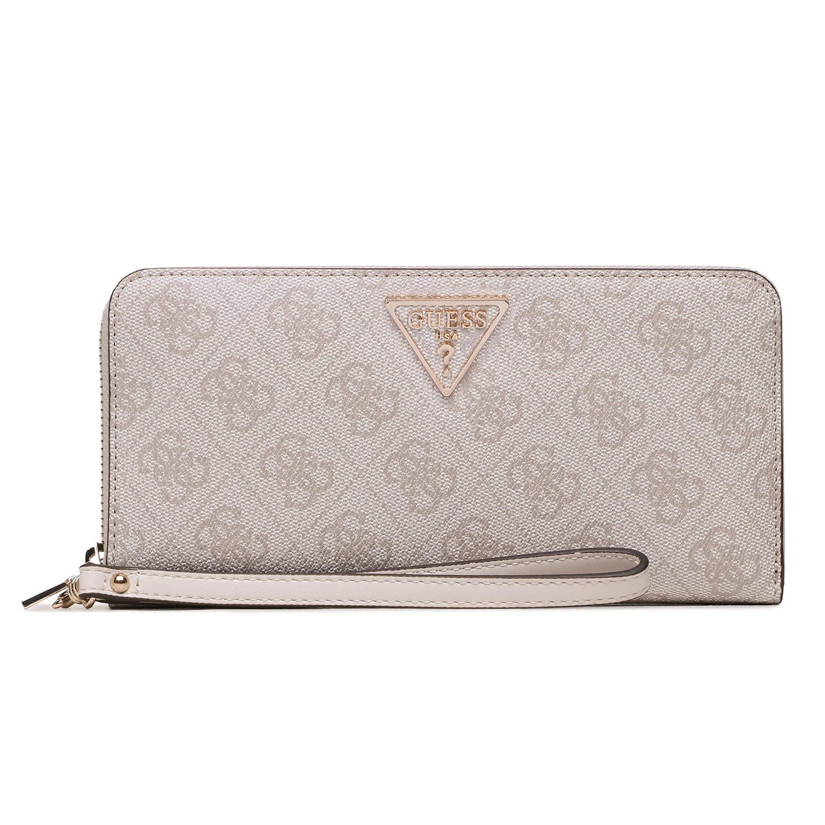 Ta mała galanteria LAUREL SLG LARGE ZIP AROUND marki GUESS to akcesorium o wyrazistym charakterze, które łączy w sobie przestronne wnętrze z elegancką formą zewnętrzną. Całość pokryta jest powtarzającym się motywem logo, a centralne miejsce zajmuje metalowy trójkątny emblemat, co nadaje produktowi prestiżowy wygląd. Dodatkowy pasek na nadgarstek zwiększa komfort użytkowania.