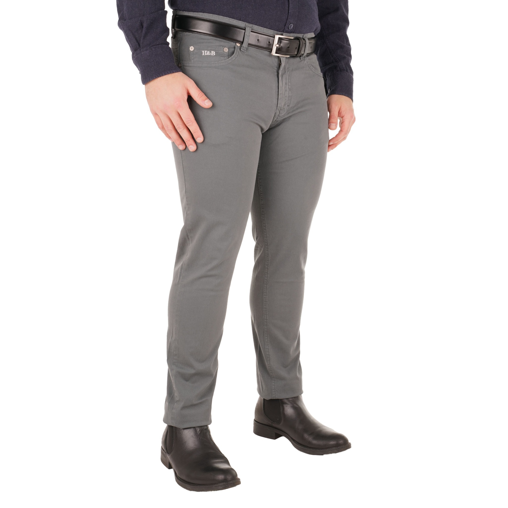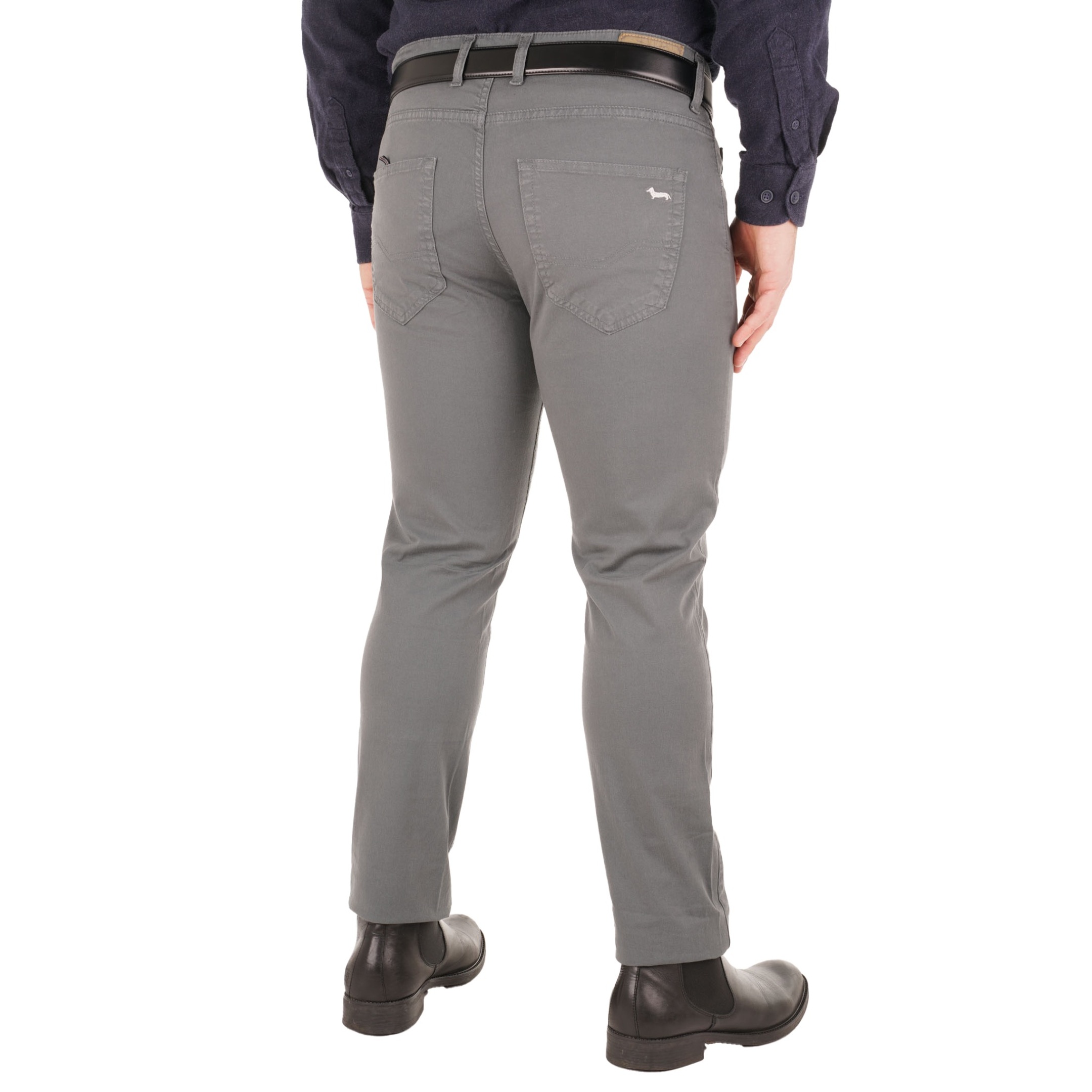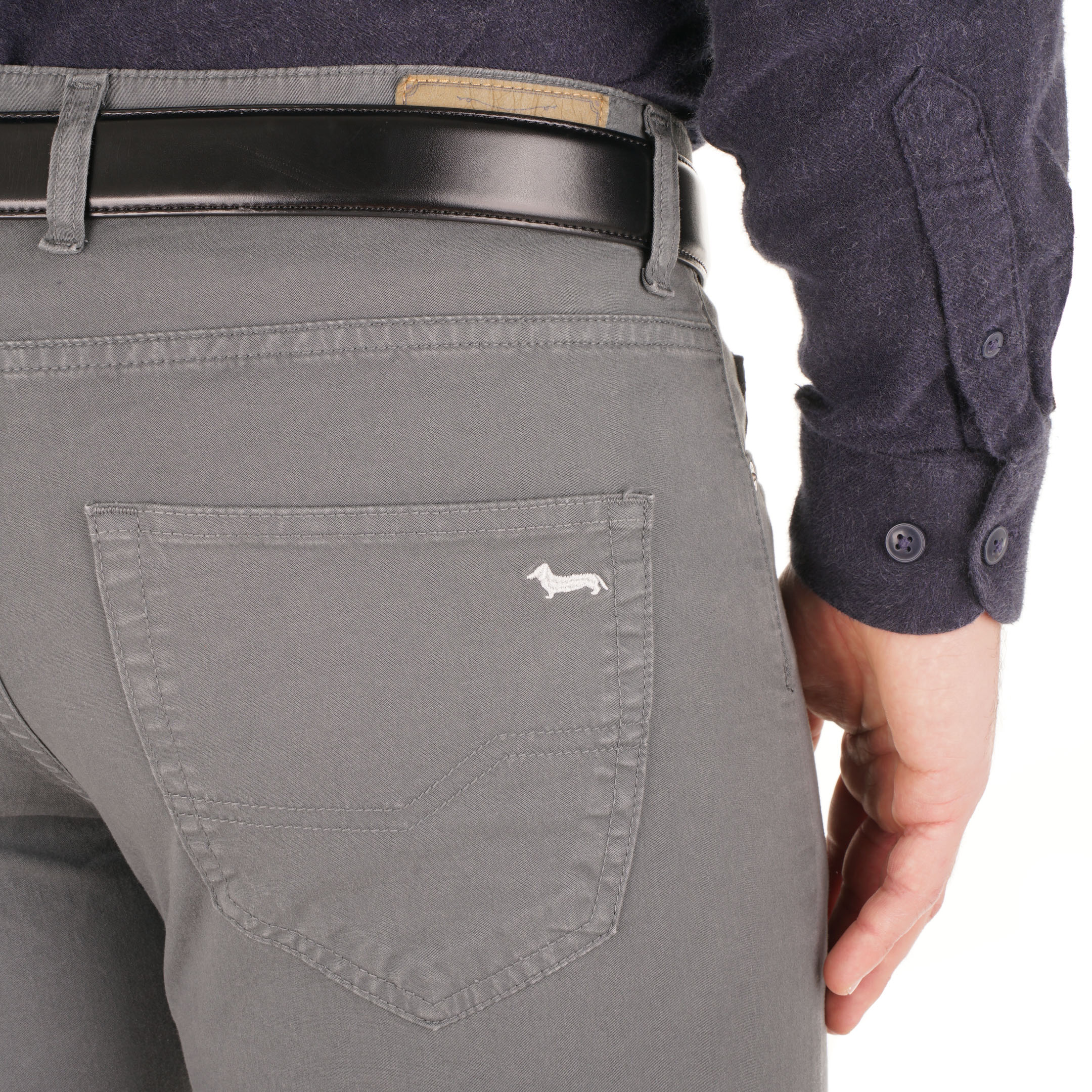 Spodnie o dopasowanym fasonie od Harmont & Blaine charakteryzują się krojem, który zaznacza męską sylwetkę. Produkt wykonany we Włoszech opiera się na wysokogatunkowej bawełnie z elastycznym włóknem, co zwiększa wytrzymałość materiału. Pięć kieszeni, wzmocnionych metalowymi nitami, oraz skrupulatne przeszycia świadczą o kunszcie wykonania. Logo marki umieszczone na małej kieszonce potwierdza autentyczność projektu. Zapięcie na zamek i guzik zapewnia funkcjonalność, tworząc uporządkowaną całość pozbawioną zbędnych ozdób.