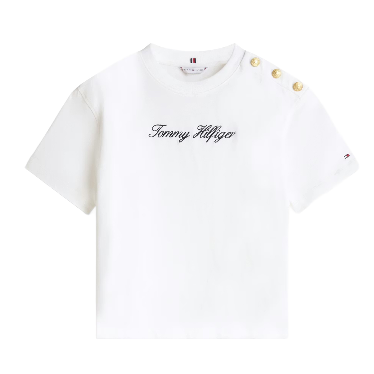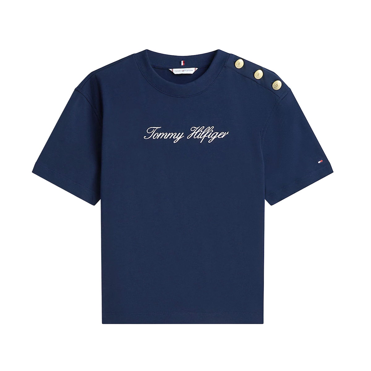 Ta T SHIRT GOLD BTN SCRIPT MDRN, YBL marki TOMMY HILFIGER to propozycja łącząca minimalistyczny krój z biżuteryjnymi akcentami. Koszulka charakteryzuje się okrągłym dekoltem i krótkimi rękawami, a jej głównym elementem dekoracyjnym są złote guziki na ramieniu, które nadają całości elegancki charakter. Haftowane logo w formie skryptu na piersi dyskretnie podkreśla prestiż marki w kanale sprzedaży hurtowej.
