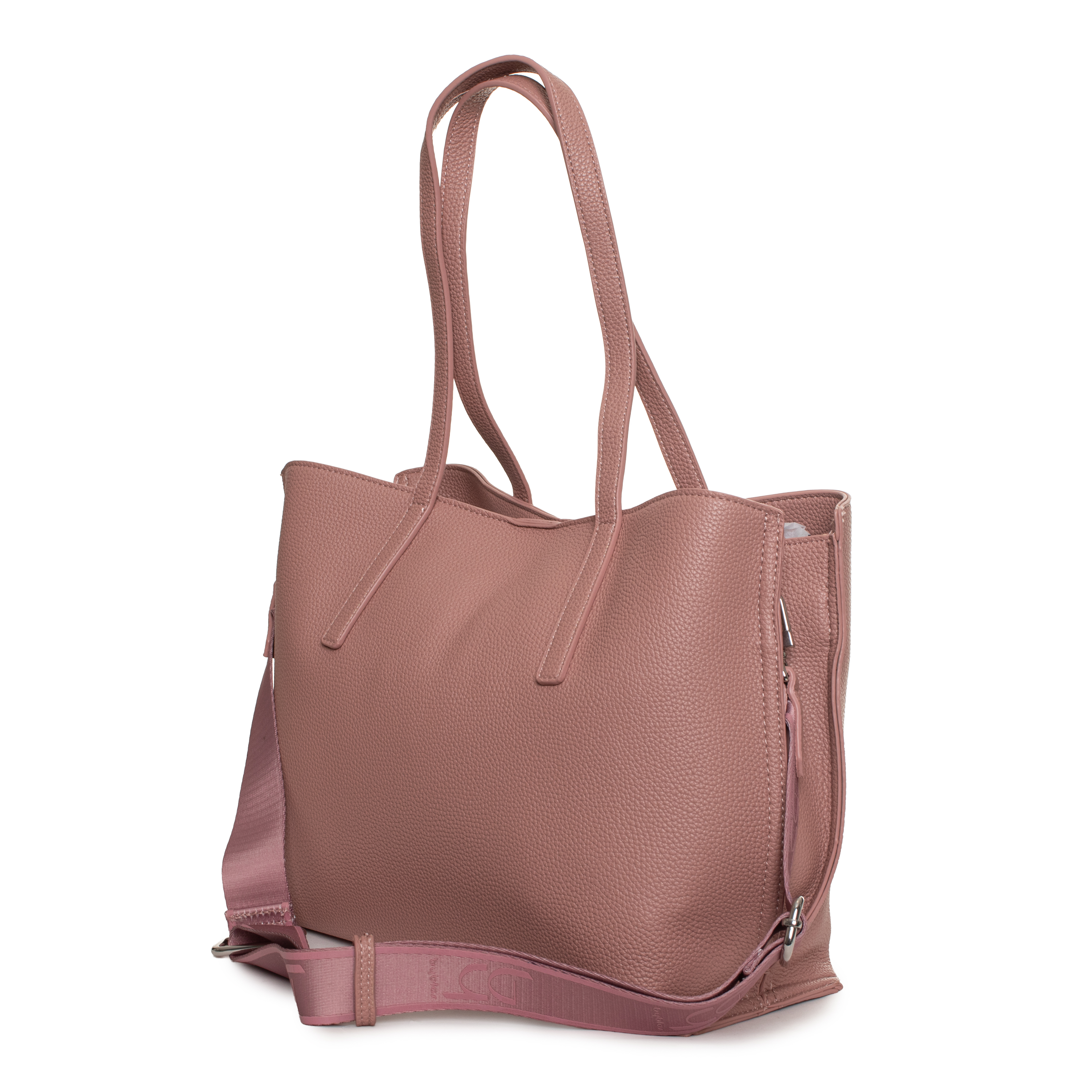 Această geantă de umăr Windsor de la Byblos este o piesă de o eleganță pragmatică, definită prin volumul său generos și marginile ușor rotunjite. Designul este punctat de detalii metalice riguroase, precum țintele dispuse vertical la baza mânerelor, care conferă o notă de soliditate ansamblului. Logo-ul metalic discret plasat frontal și cureaua lată, inscripționată, adaugă un contrast vizual modern texturii granulate a materialului.