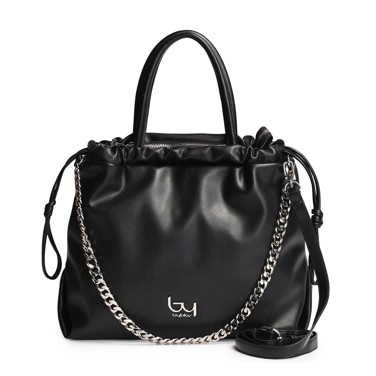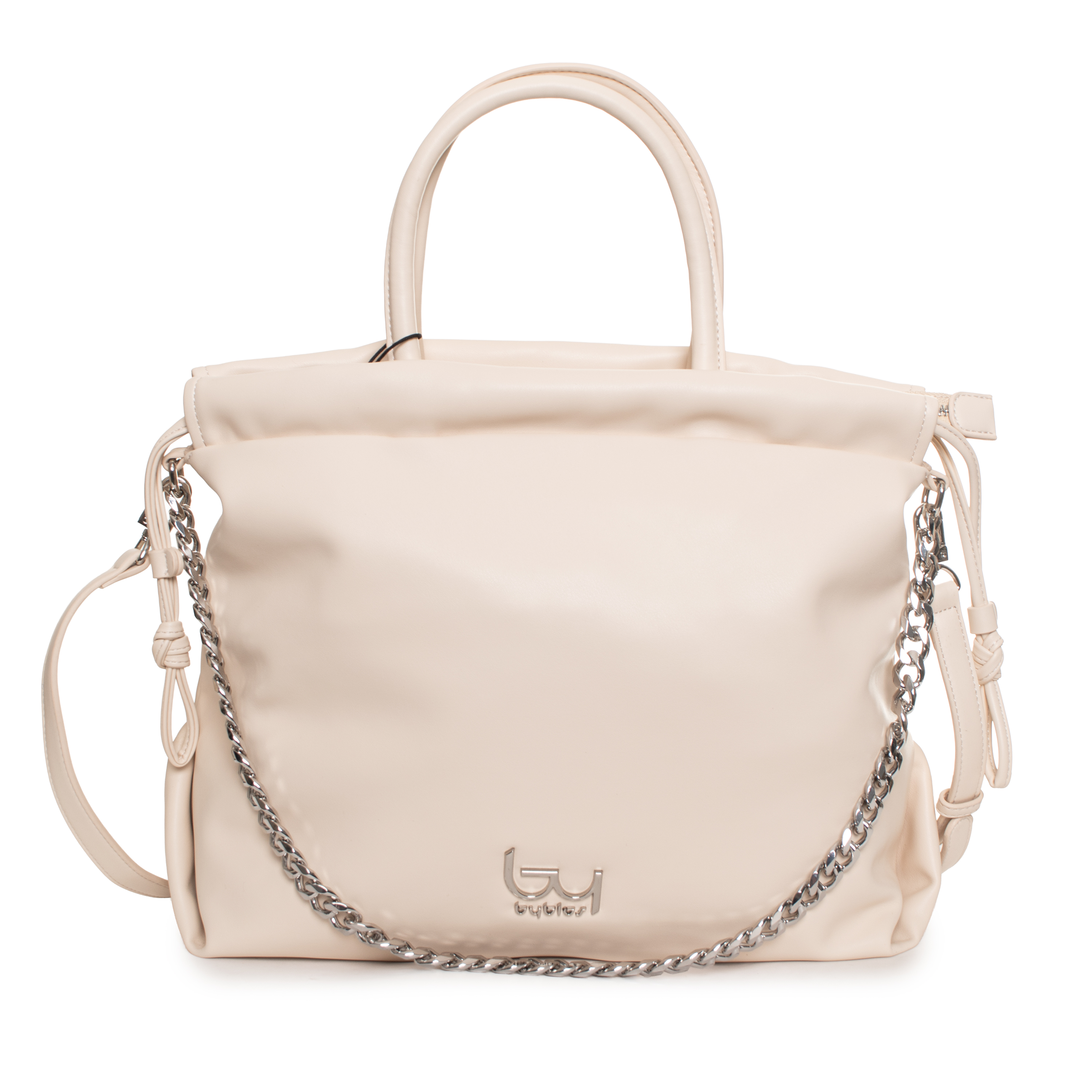 Această geantă de mână Gomez de la Byblos este un accesoriu cu o estetică rafinată, definită prin linii curbe și detalii metalice discrete. Partea superioară este prevăzută cu o margine încrețită care adaugă textură designului, fiind completată de un lanț decorativ și un logo metalic plasat strategic.