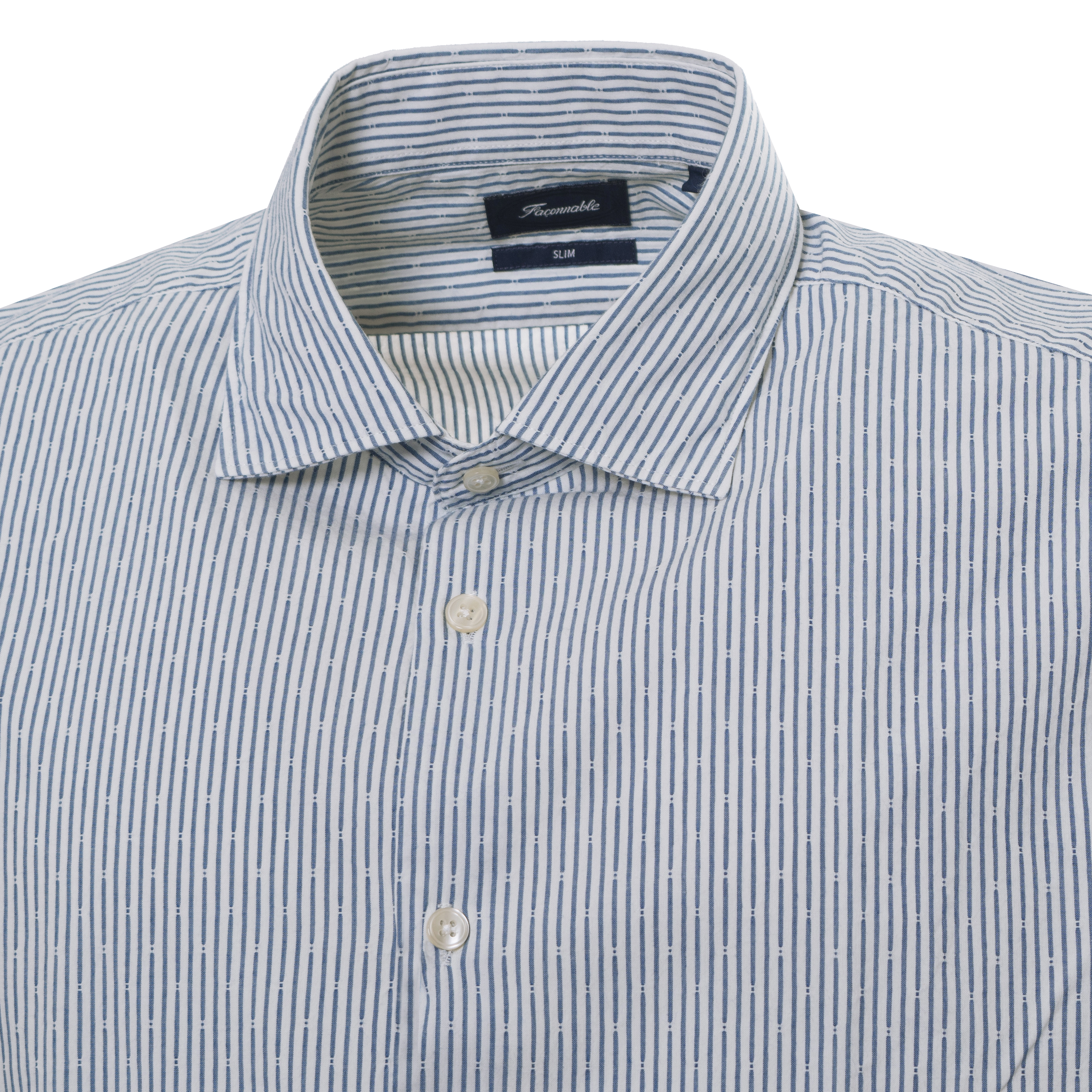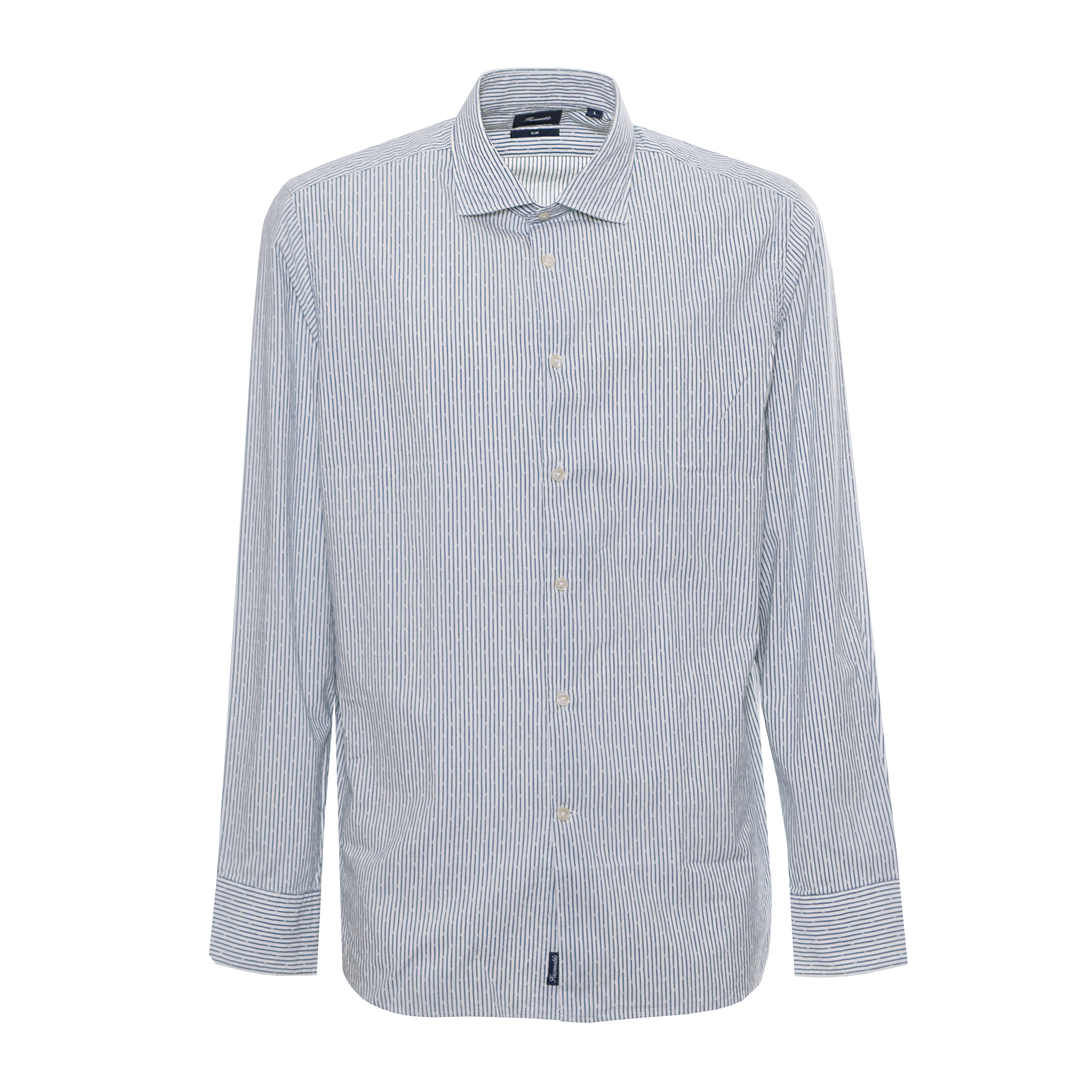Această cămașă SLIM SPRD DOBBY IND de la FACONNABLE propune o siluetă modernă, definită printr-o croială mulată și linii curate. Gulerul clasic și dungile verticale bicolore creează o estetică ordonată, oferind un aspect vizual coerent și o structură bine definită în zona umerilor. Designul cu mâneci lungi subliniază profilul zvelt al piesei.