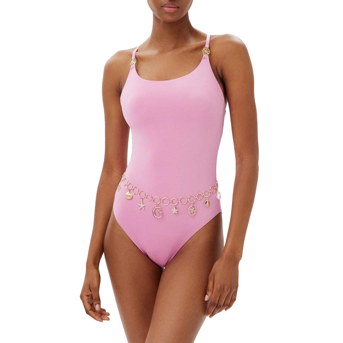 Acest costum de baie întreg ONE PIECE WITH BELT de la GUESS este o piesă vestimentară care pune accent pe simplitate și detalii prețioase. Decolteul rotund și bretelele subțiri cu inserții metalice circulare definesc partea superioară, în timp ce talia este marcată de o curea tip lanț cu pandantive tematice, oferind un aspect sofisticat. Croiala cu picior înalt conferă o estetică modernă și fluidă.