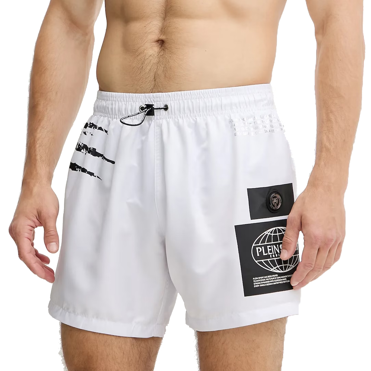 Acest costum de baie PLANET MEDIUM BOARDSHORT de la PLEIN SPORT este un articol vestimentar definit prin detalii grafice puternice și o croială ergonomică. Talia este prevăzută cu un șnur reglabil și un opritor negru, completând designul ce include patch-uri rotunde și imprimeuri laterale ce evocă o estetică viguroasă.
