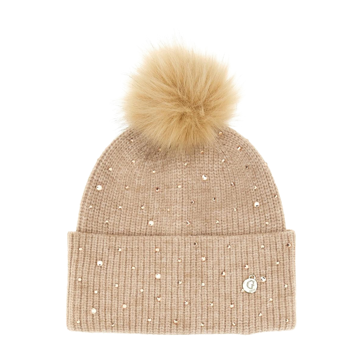 Эта шапка beanie от GUESS представляет собой аксессуар с изысканной отделкой, декорированный множеством мелких страз по всей поверхности вязки. Модель дополнена широким отворотом, создающим объем, и крупным пушистым помпоном, который придает силуэту артистичный вид.