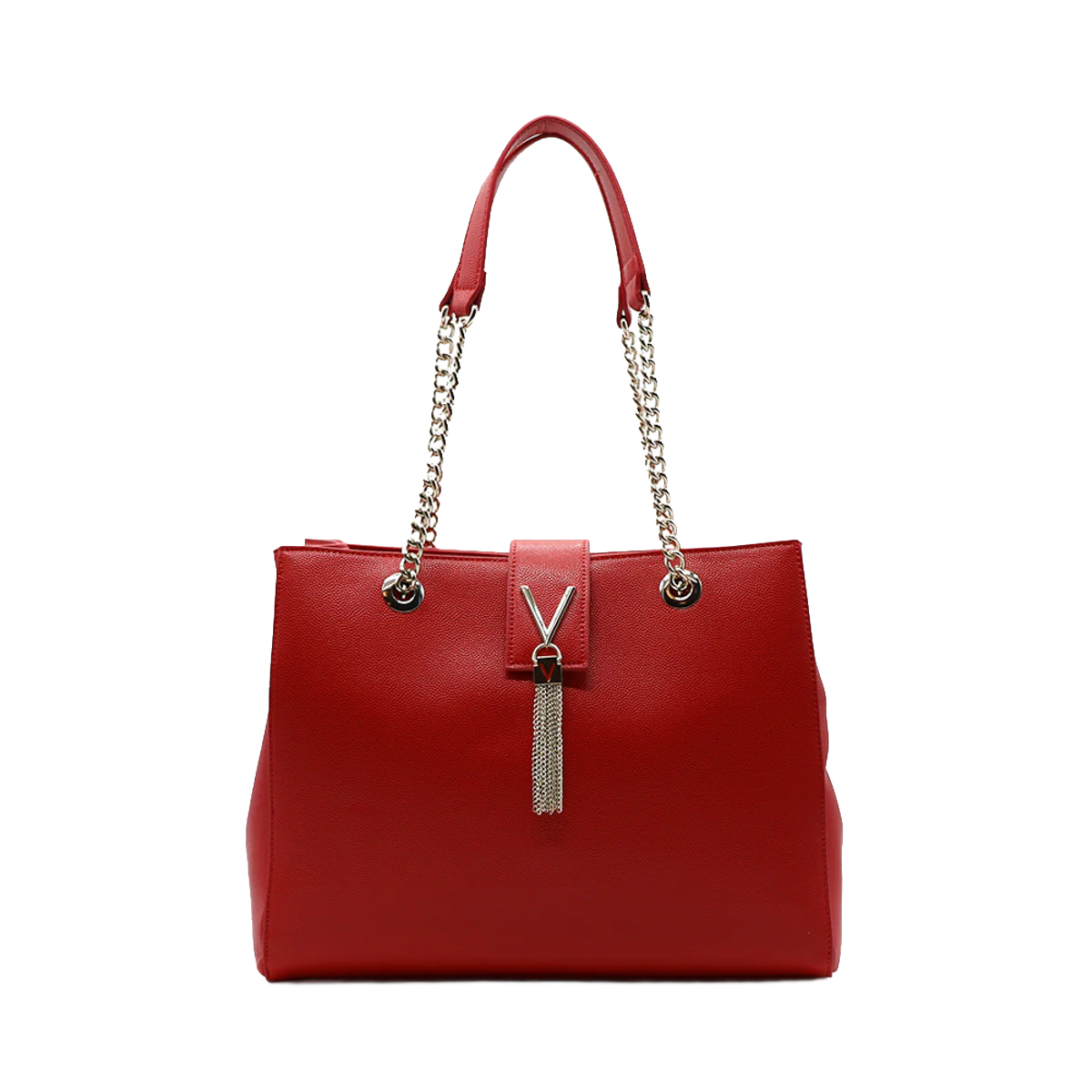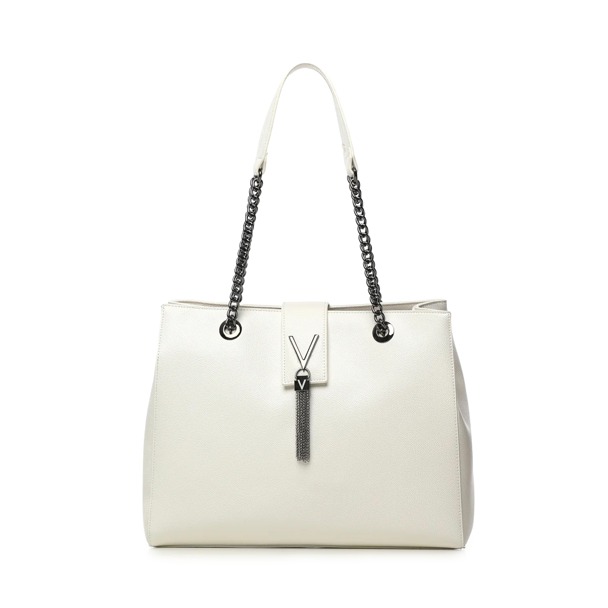 Эта сумка на плечо DIVINA от MARIO VALENTINO представляет собой образец строгого дизайна с эффектными декоративными элементами. Центральное место занимает крупный металлический логотип с ниспадающими цепочками, подчеркивающий статусность изделия.