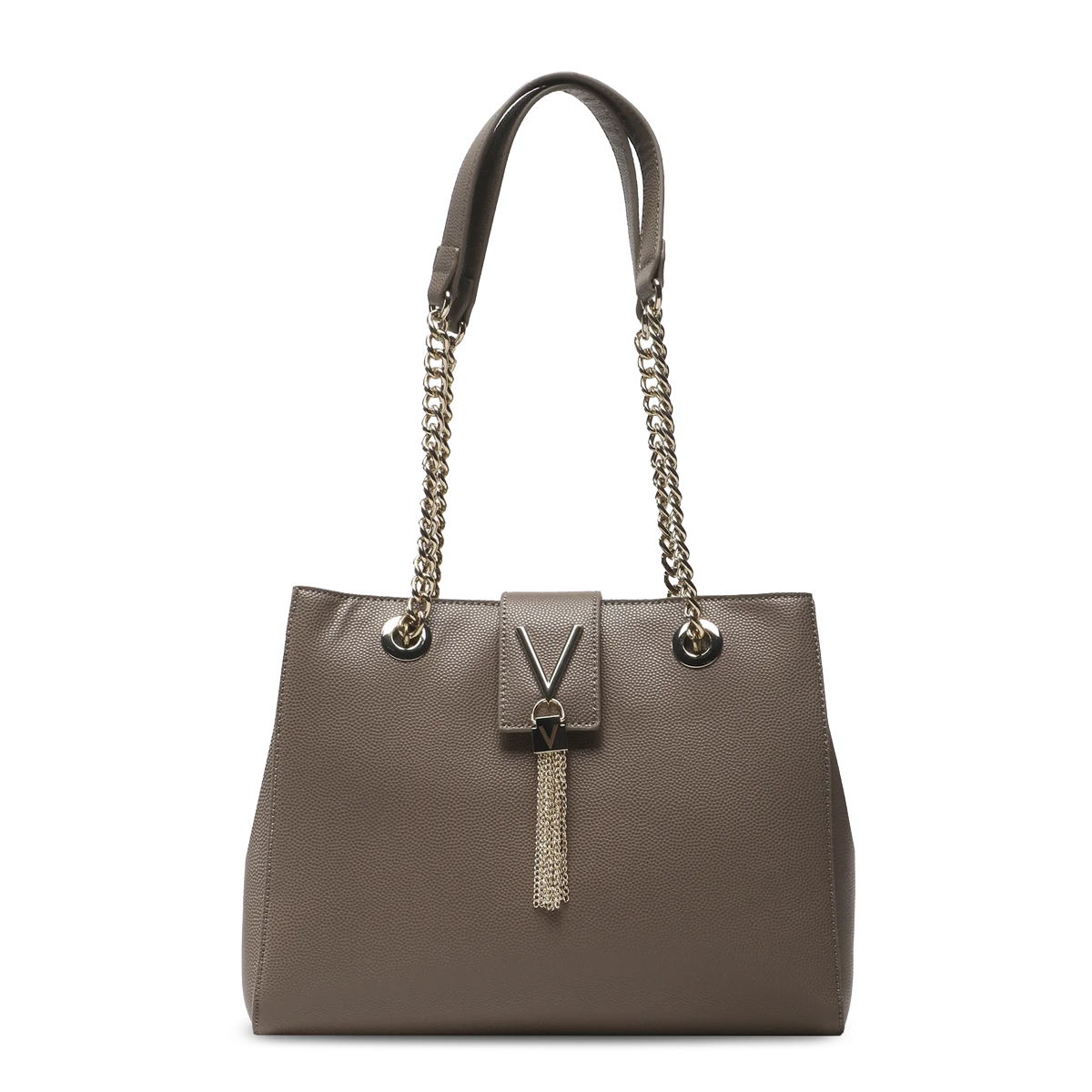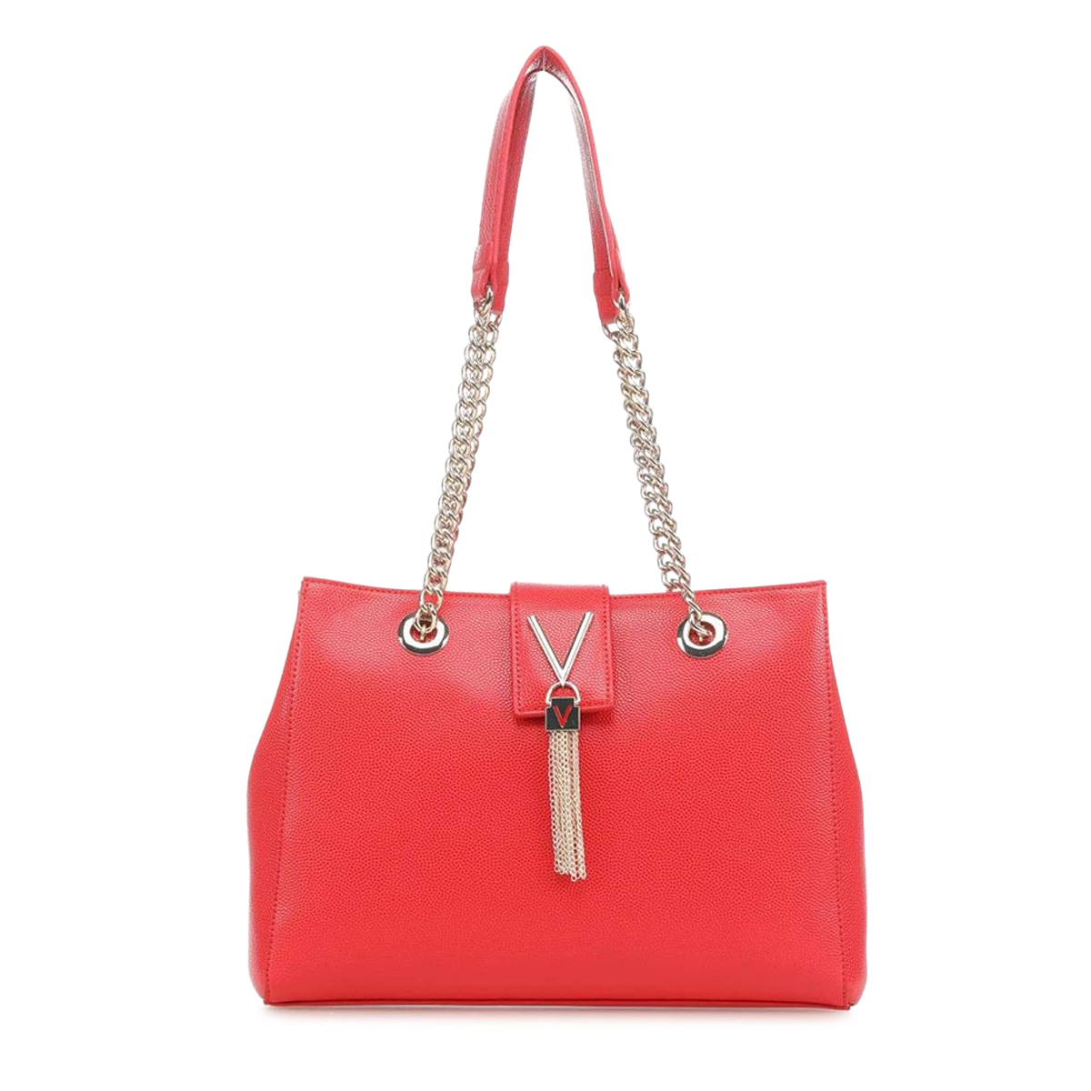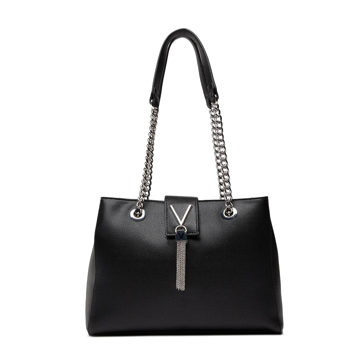 Эта сумка на плечо Divina от MARIO VALENTINO — это аксессуар с четким силуэтом и выразительной фактурой. Дизайн подчеркивается двойными ручками с металлическими цепями и центральным декоративным элементом в виде буквы V, дополненным изящной бахромой из тонких цепочек.