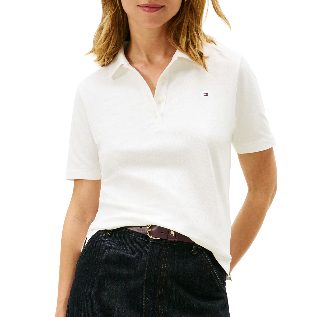 POLO SHIRT, FOR WOMEN, SHORT SLEEVES, SOLID COLOUR, EMBROIDERED LOGO, WITH BUTTONS
