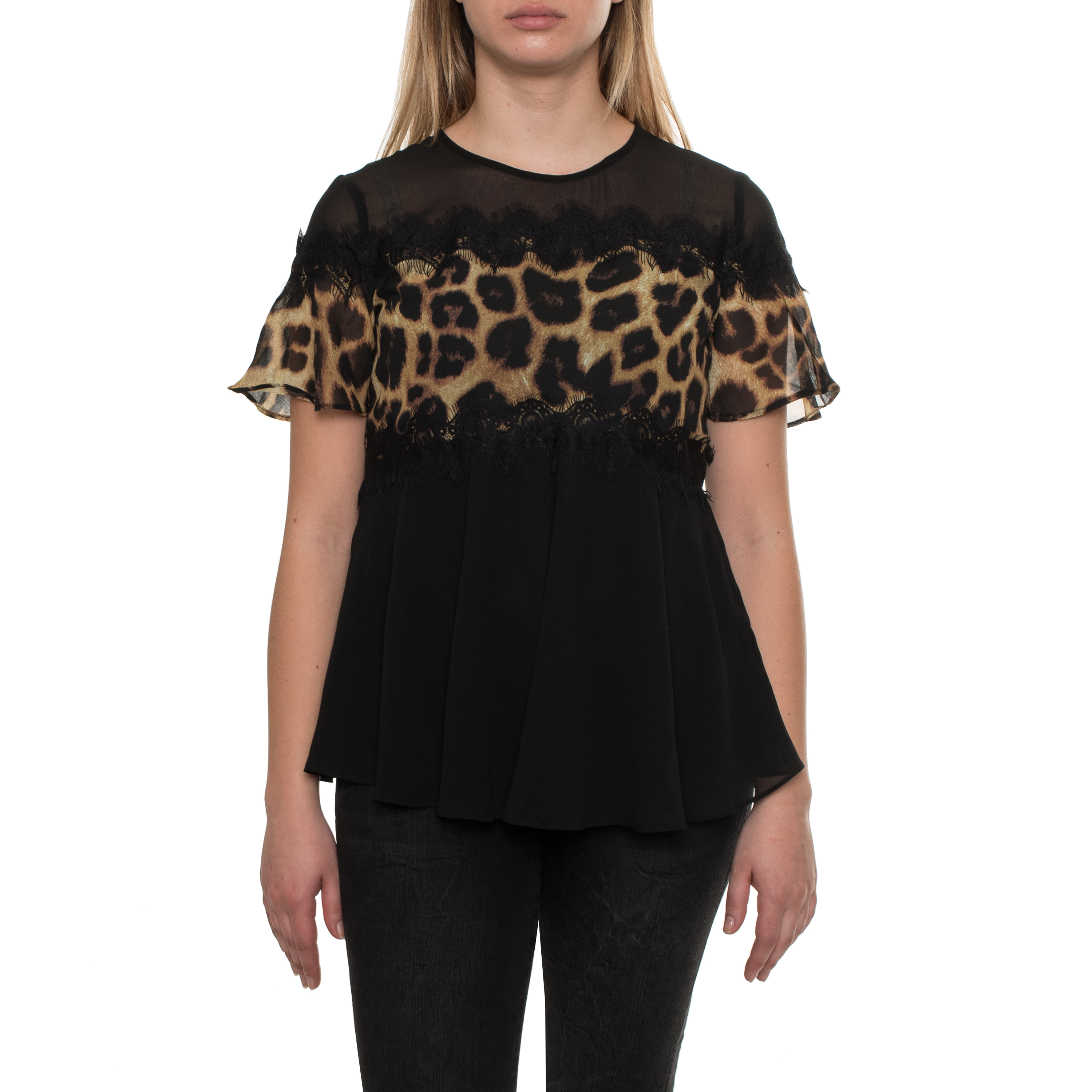 BLOUSE, FOR WOMEN, ROUNDNECK, SHORT SLEEVES, LEOPARD, WITH LOGO
