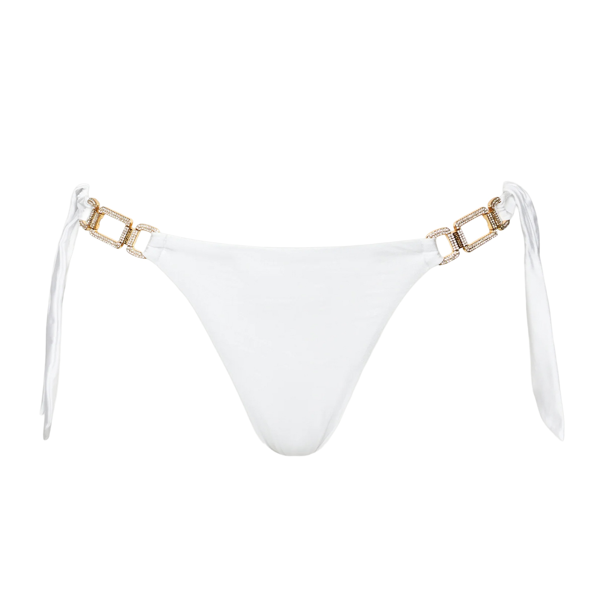 Spodnji del kopalk znamke GUESS v brazilskem kroju zaznamujejo prefinjeni kovinski dodatki na bokih. Pravokotni členi z bleščečimi detajli povezujejo sprednjo ploščo s stranskimi trakovi za zavezovanje, kar omogoča poljubno prilagajanje in dodaja estetsko vrednost. Celoten dizajn odraža skrbno načrtovano strukturo, ki poudarja stransko linijo z močnim vizualnim poudarkom na dekorativnih elementih.