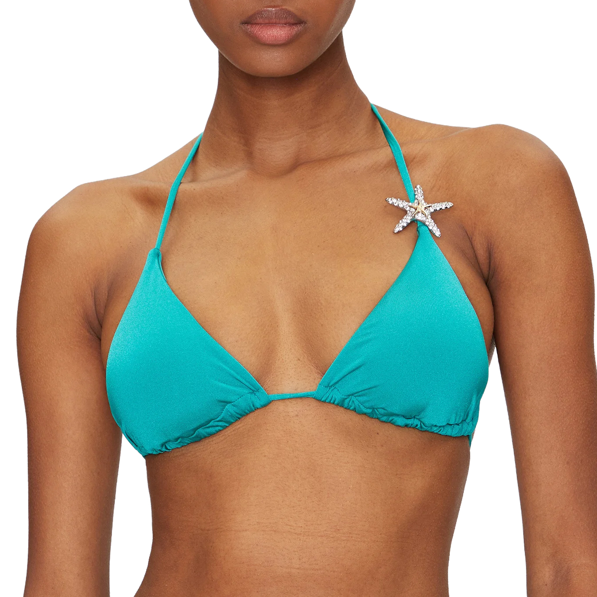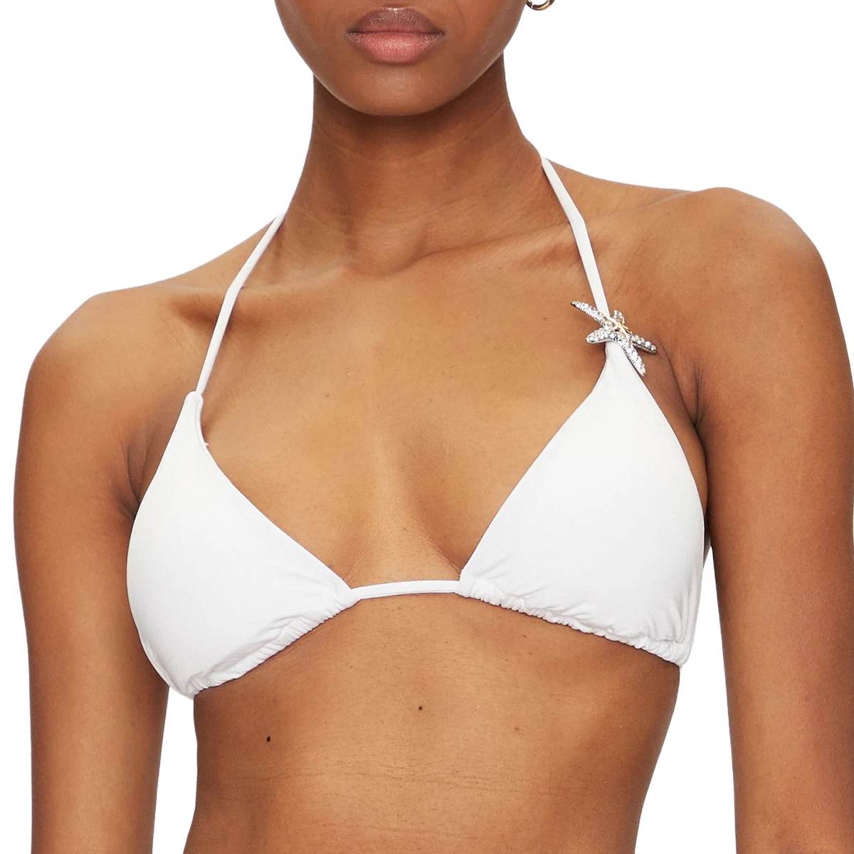 Ta bikini znamke GUESS odlikuje brezčasna trikotna oblika z modernimi poudarki. Zgornji del z drsnimi košaricami vključuje dekorativni element v obliki morske zvezde na naramnici, ki ustvarja prefinjen vizualni učinek. Spodnji del z nizkim pasom dopolnjujejo kovinski obročki ob straneh, ki zagotavljajo stabilnost kroja.