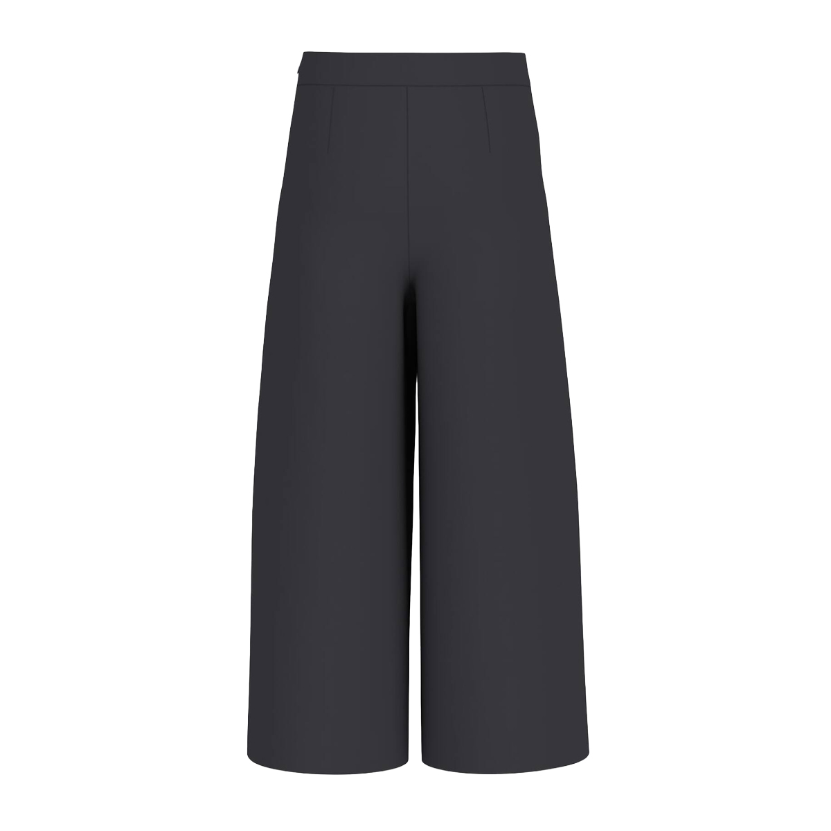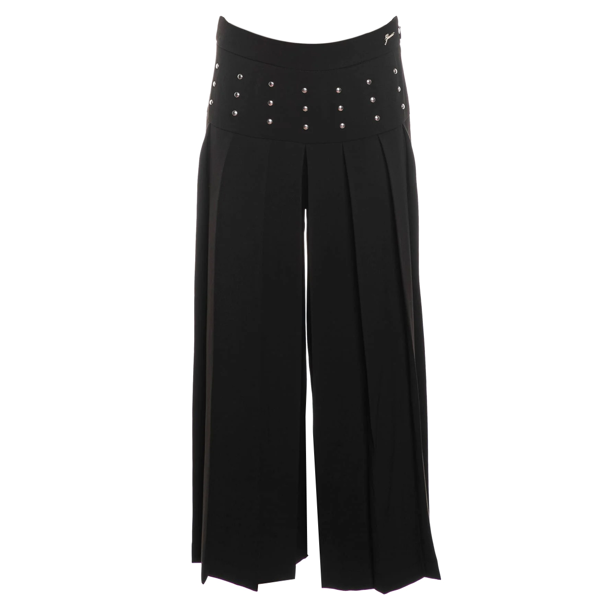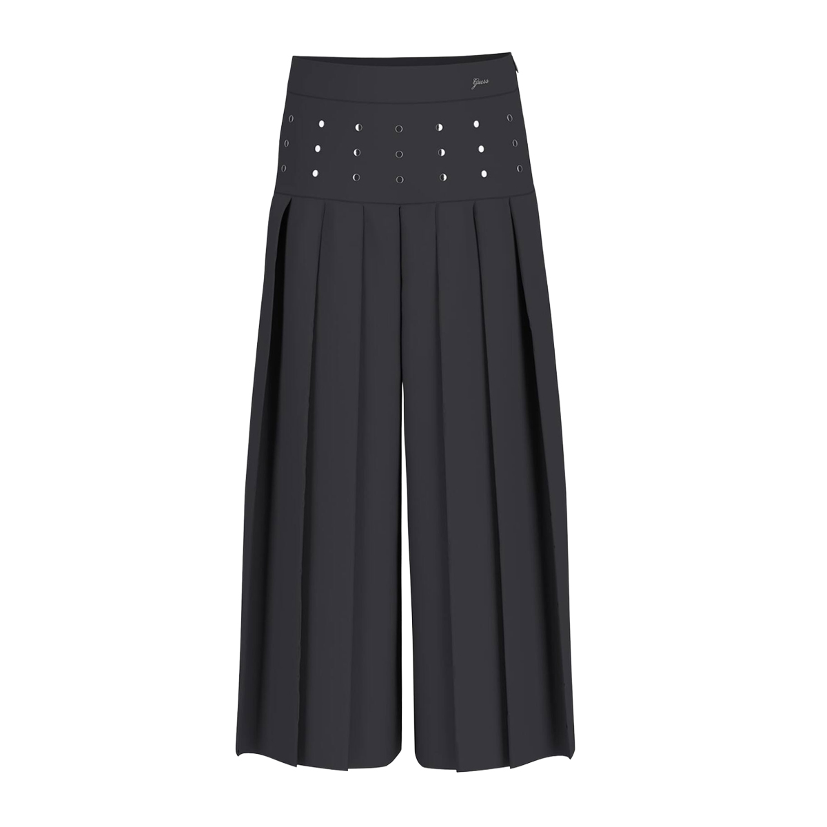 Te PANTALONI CREPE CULOTTE PANTS_CEREMONY znamke GUESS odlikujejo široke hlačnice in prefinjeno strukturirane gube. Visok pas je okrašen s kovinskimi obročki, ki služijo kot sodoben dekorativni element, hkrati pa poudarijo prehod v bogato gubanje spodnjega dela. Krojenje v stilu culotte hlač omogoča izjemno svobodo gibanja, medtem ko stranska zadrga ohranja silhueto elegantno in neprekinjeno.