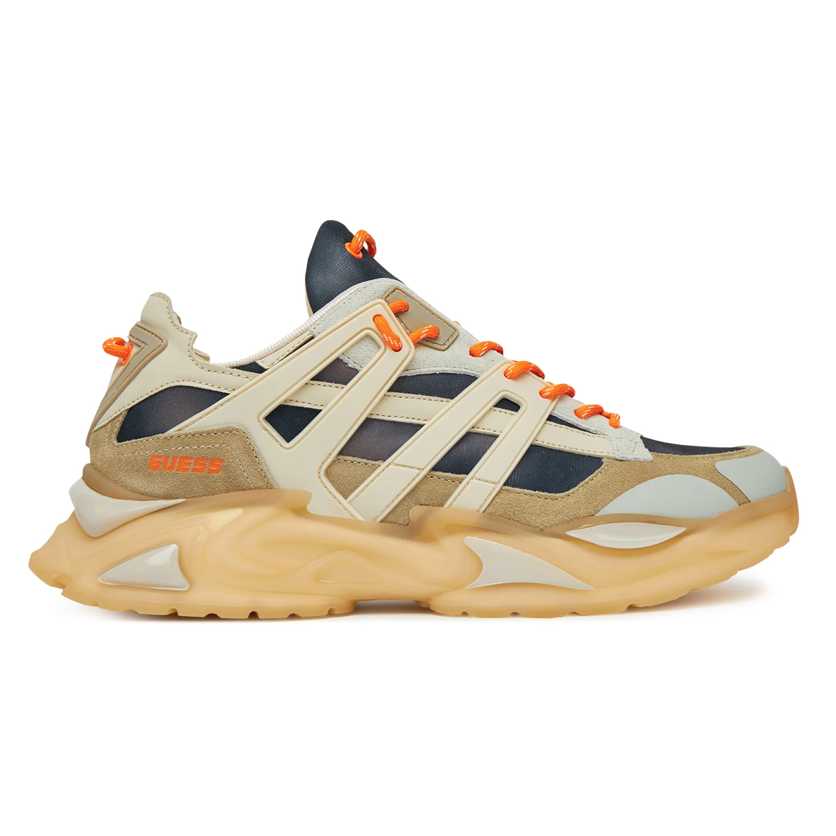 Ta čevelj Belluno Low znamke Guess je prepoznaven po svojem voluminoznem podplatu z valovitimi linijami in prosojnimi detajli. Zgornji del odlikuje preplet strukturiranih slojev, ki stopalu nudijo odlično oporo, hkrati pa ustvarjajo vizualno bogat in kompleksen profil.