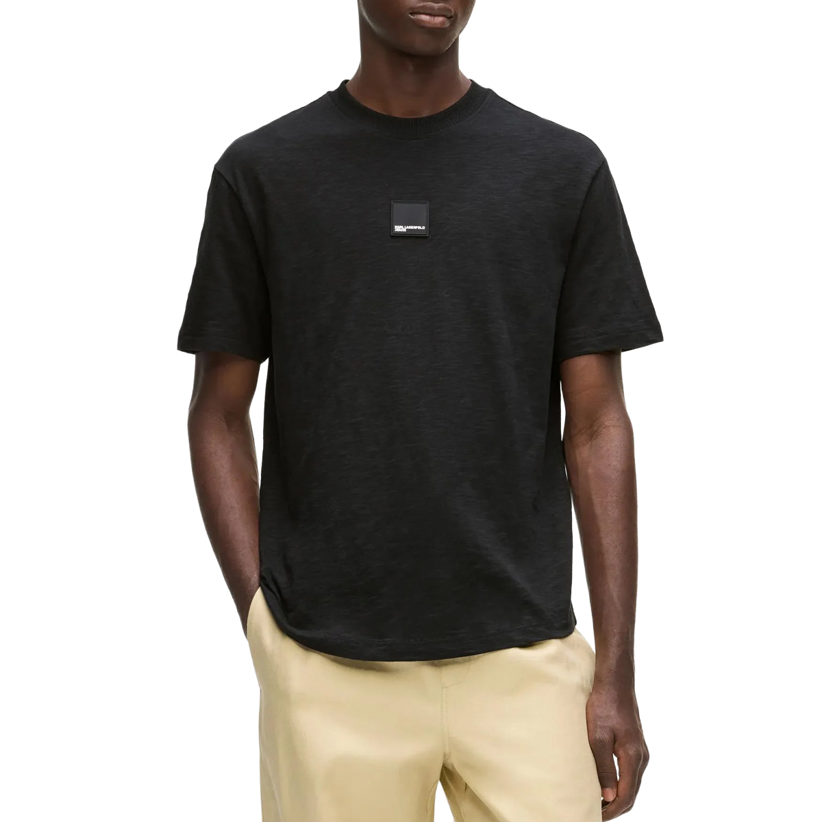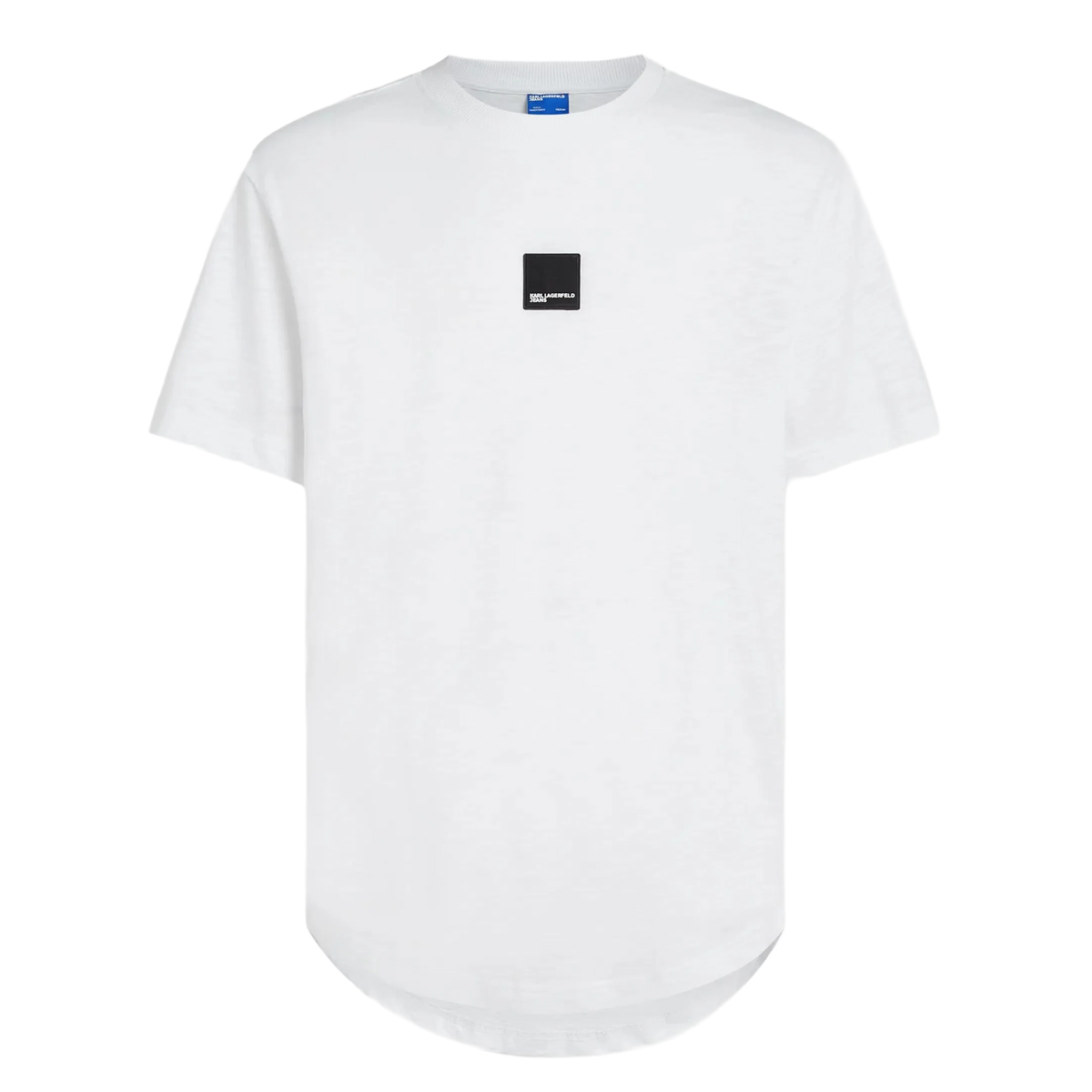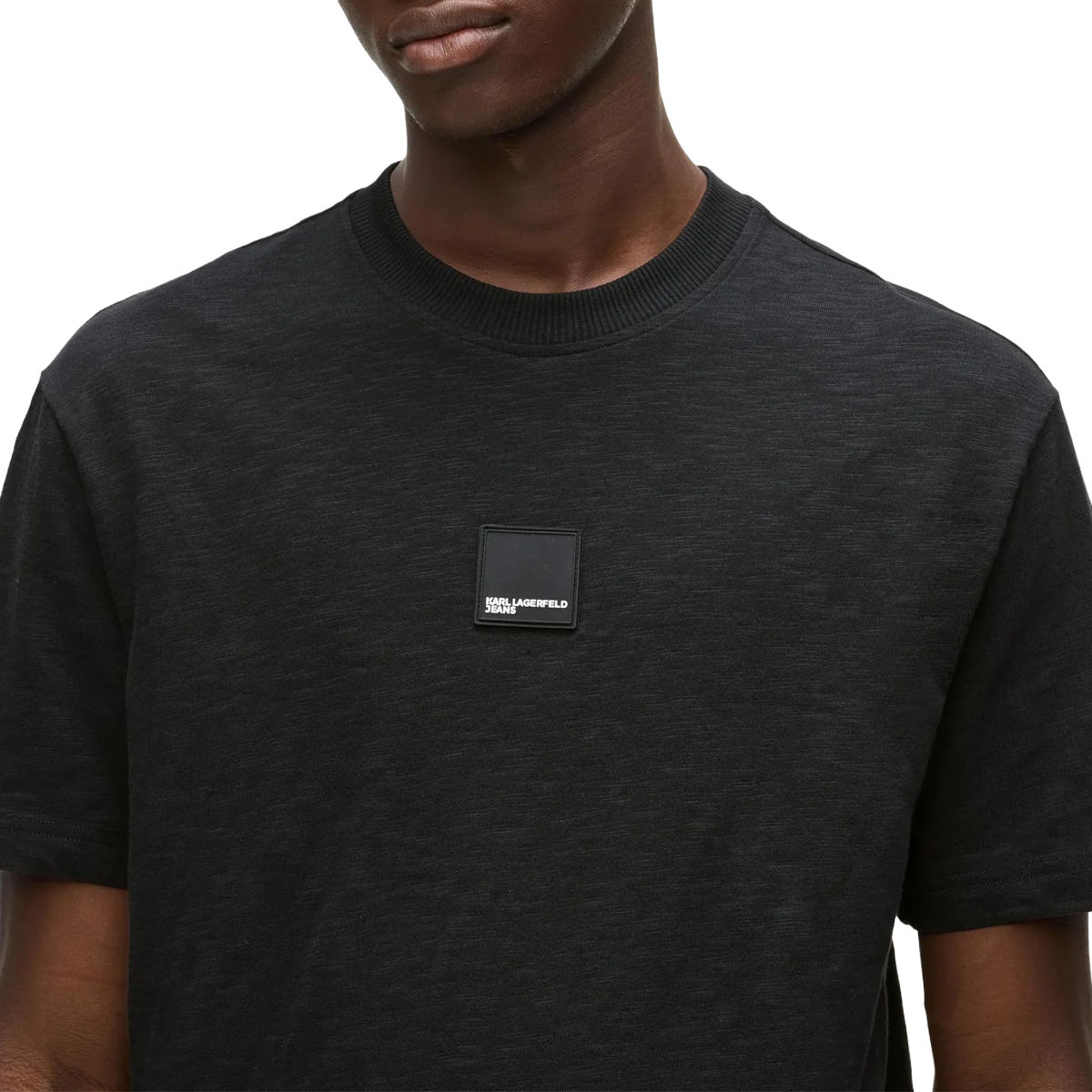 Ta T SHIRT KLJ Reg Curved Hem Slub Tee znamke KARL LAGERFELD JEANS izstopa s svojo teksturirano površino in premišljenim krojem. Zaobljen spodnji rob ustvarja sproščeno silhueto, ki se lepo prilega telesu in omogoča neovirano gibanje.