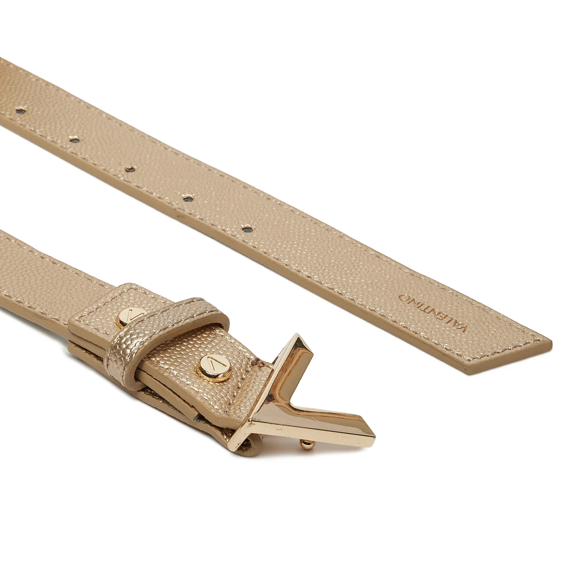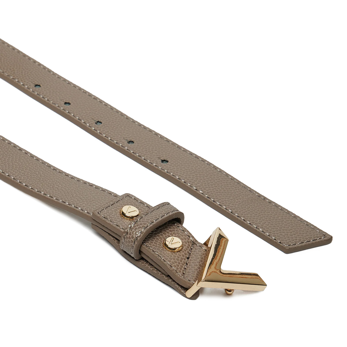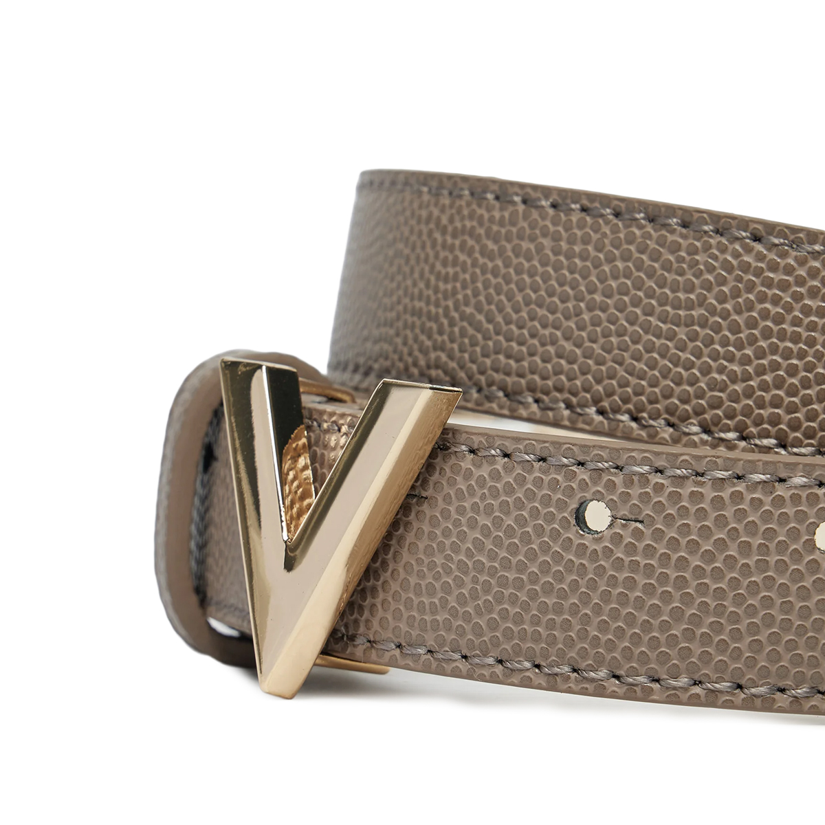 Ta pas Divina znamke Mario Valentino je zasnovan s poudarkom na geometrijski eleganci in močni identiteti. Kovinska zaponka v obliki začetnice prevladuje nad celotno zasnovo, medtem ko drobno zrnata tekstura pasu ustvarja prefinjen kontrast s sijajem kovine.